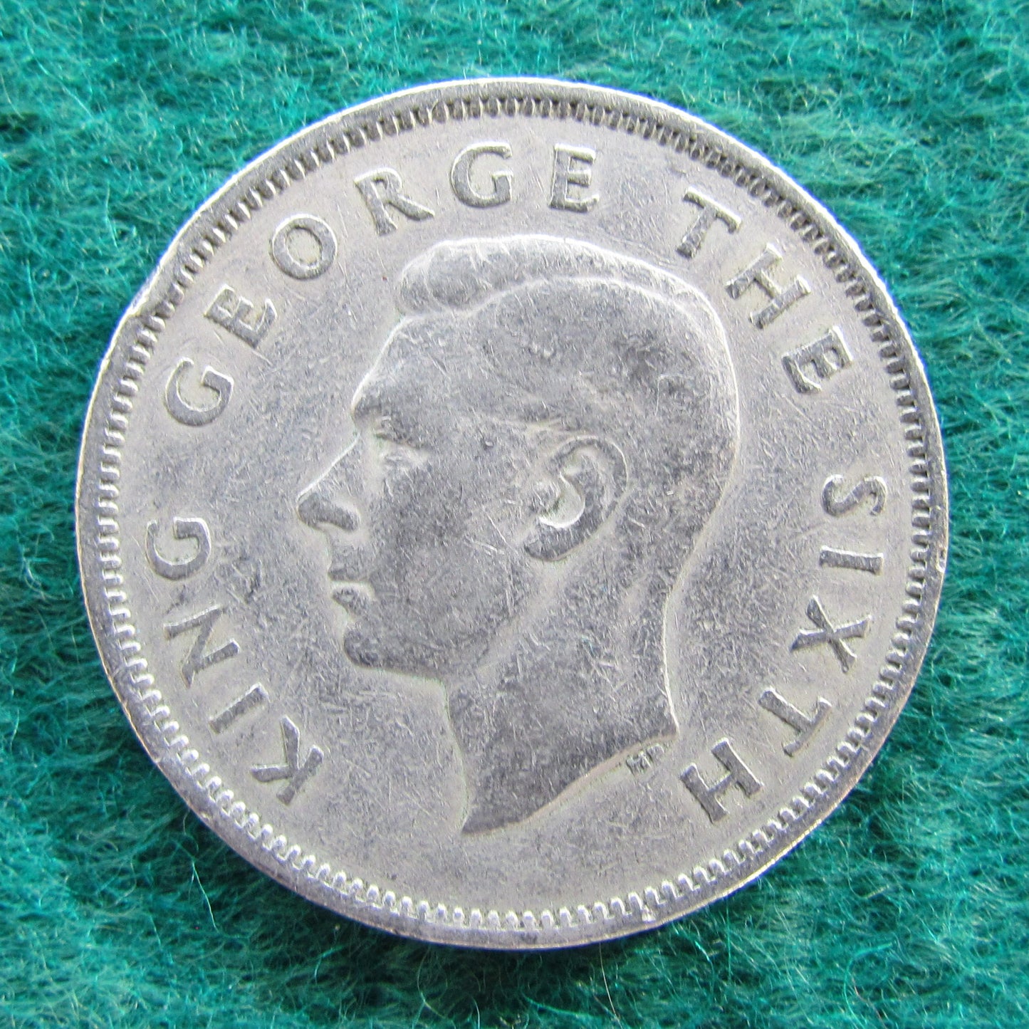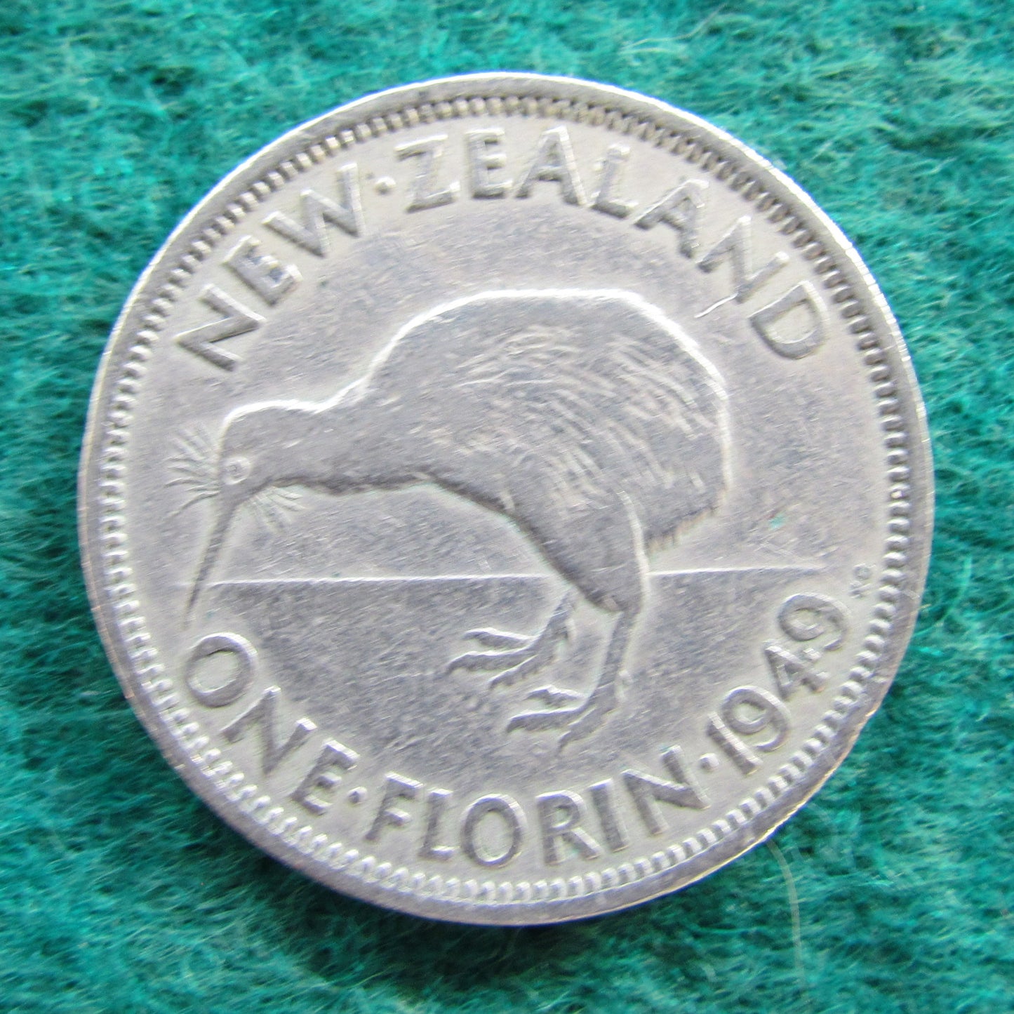 New Zealand 1949 Florin King George VI Coin. A good coin showing wear and tear consistent with its period in circulation, there is a rim hit on the obverse side, please view images. All images shown are actual coin.