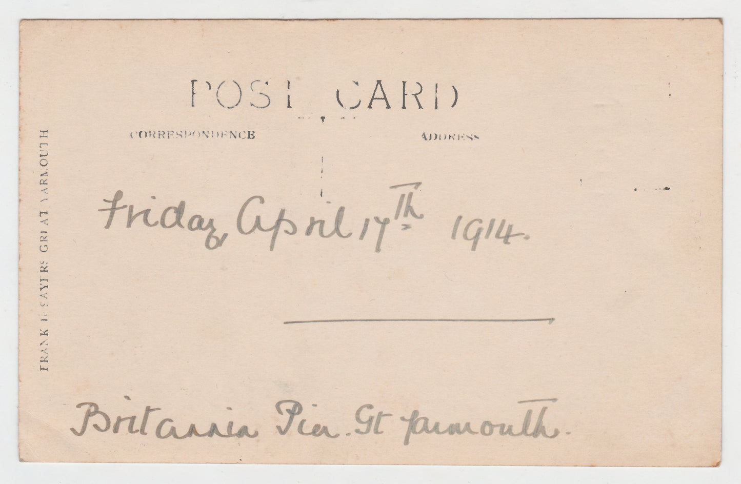 Postcard Brittania Pier Fire Great Yarmouth 17th April 1914. Used postcard removed from postcard album with crimped corners, may have handling wear, creasing & some discolouration please view images.