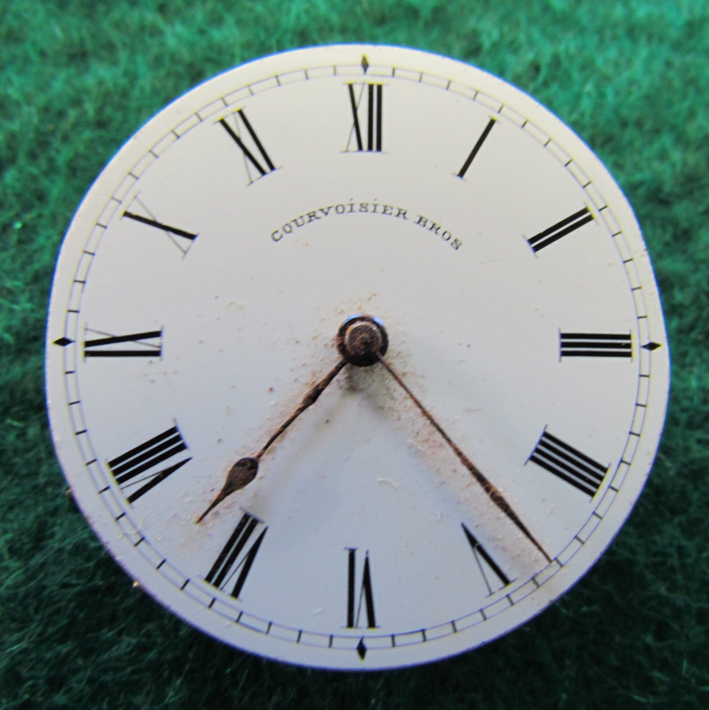 Courviosier Brothers Partial Key Wind Watch Movement 31.1mm. A highly regarded manufacturer of quality timepieces, this ladies pocket watch movement with enamelled dial and hands for spares or repair not working no warranty. The balance wheel is damaged, The watch is key wind & set. This movement has been in a cabinet since the 1960's so I unable to give any further information. Purchases on parts and incomplete movements are final and non returnable unless I have incorrectly stated details as to condition or given some form of warranty. Please ask any questions before purchasing and I will try to answer them. Please view images.