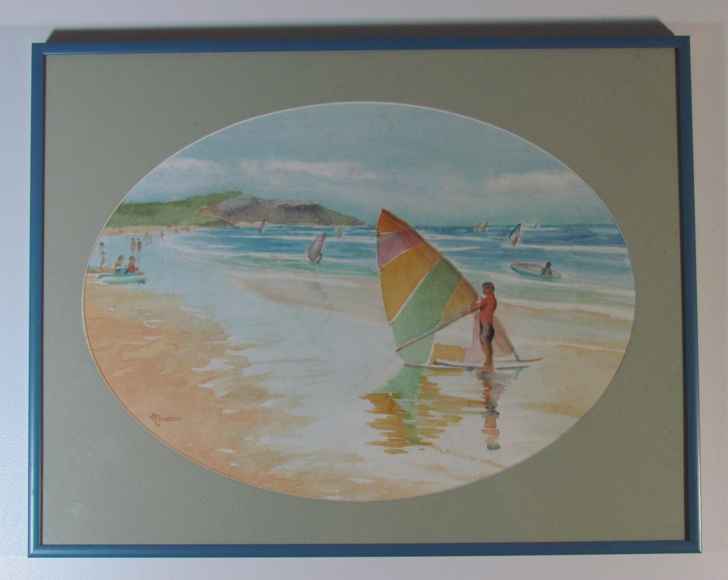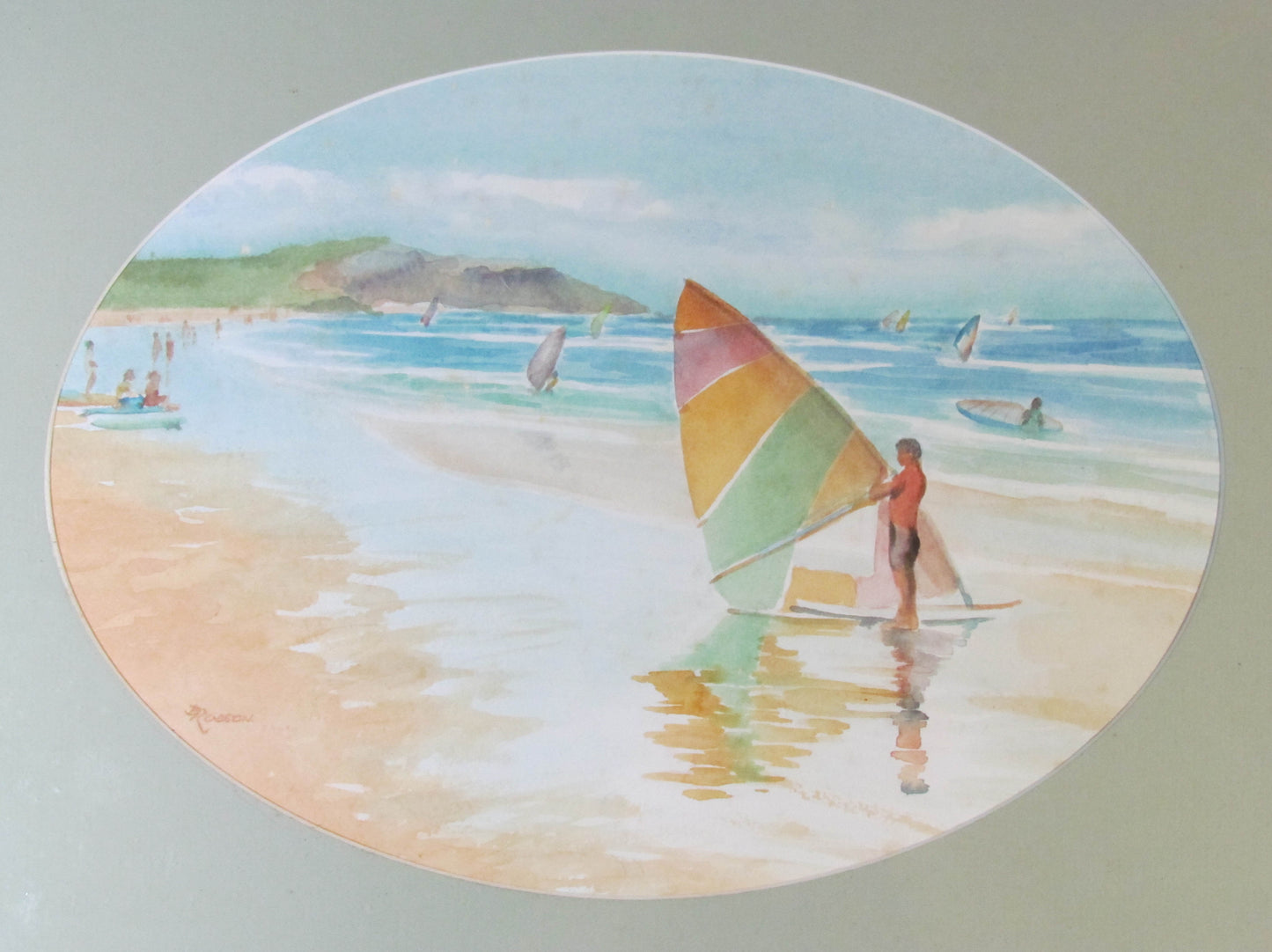 D Robson Watercolour Of Sailboarders At The Beach. An Australian watercolour untitled depicting sailboarders and onlookers at the beach, please view images. Please view images as all images are of the actual item.