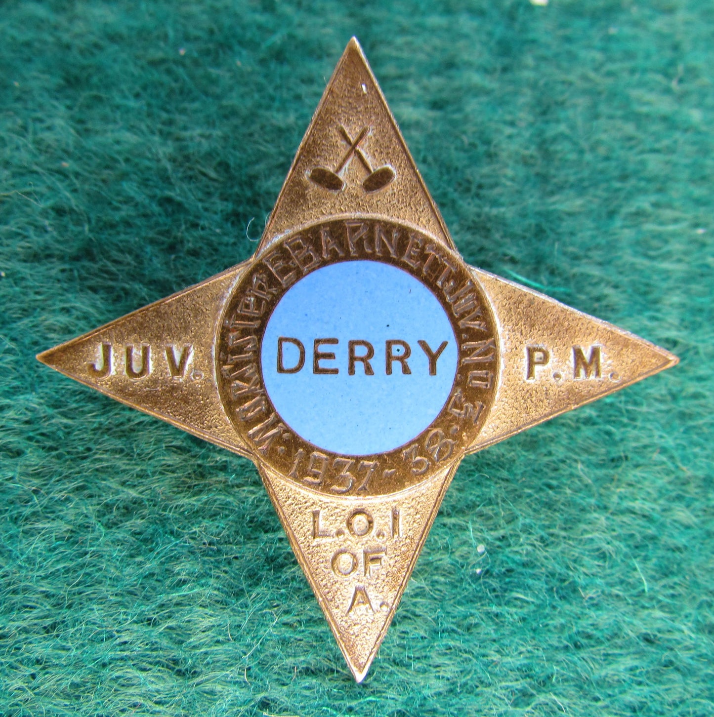 Derry Loyal Orange Institute of Australia Juvenile Past Masters Member Lapel Badge. A good example of this very hard to obtain 4 pointed star badge with light blue enamel background showing some wear and tear with natural oxidisation. Please view images as all images are of the actual item.