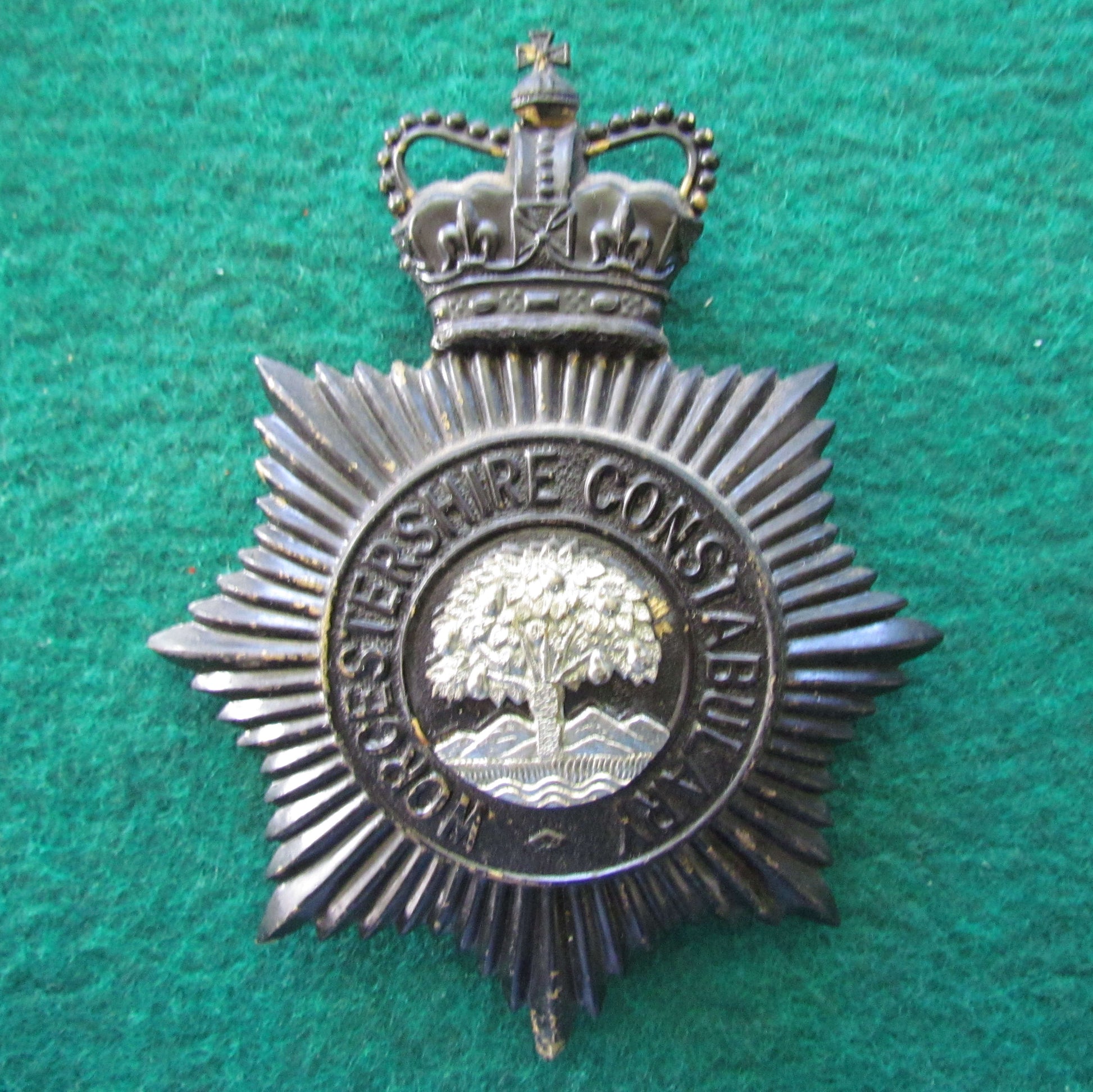 Worcestershire Constabulary Blackened Police Helmet Plate Badge Queens Crown. An authentic vintage English Worcestershire helmet plate in good condition relative to age. Please view images as all images are of the actual item.