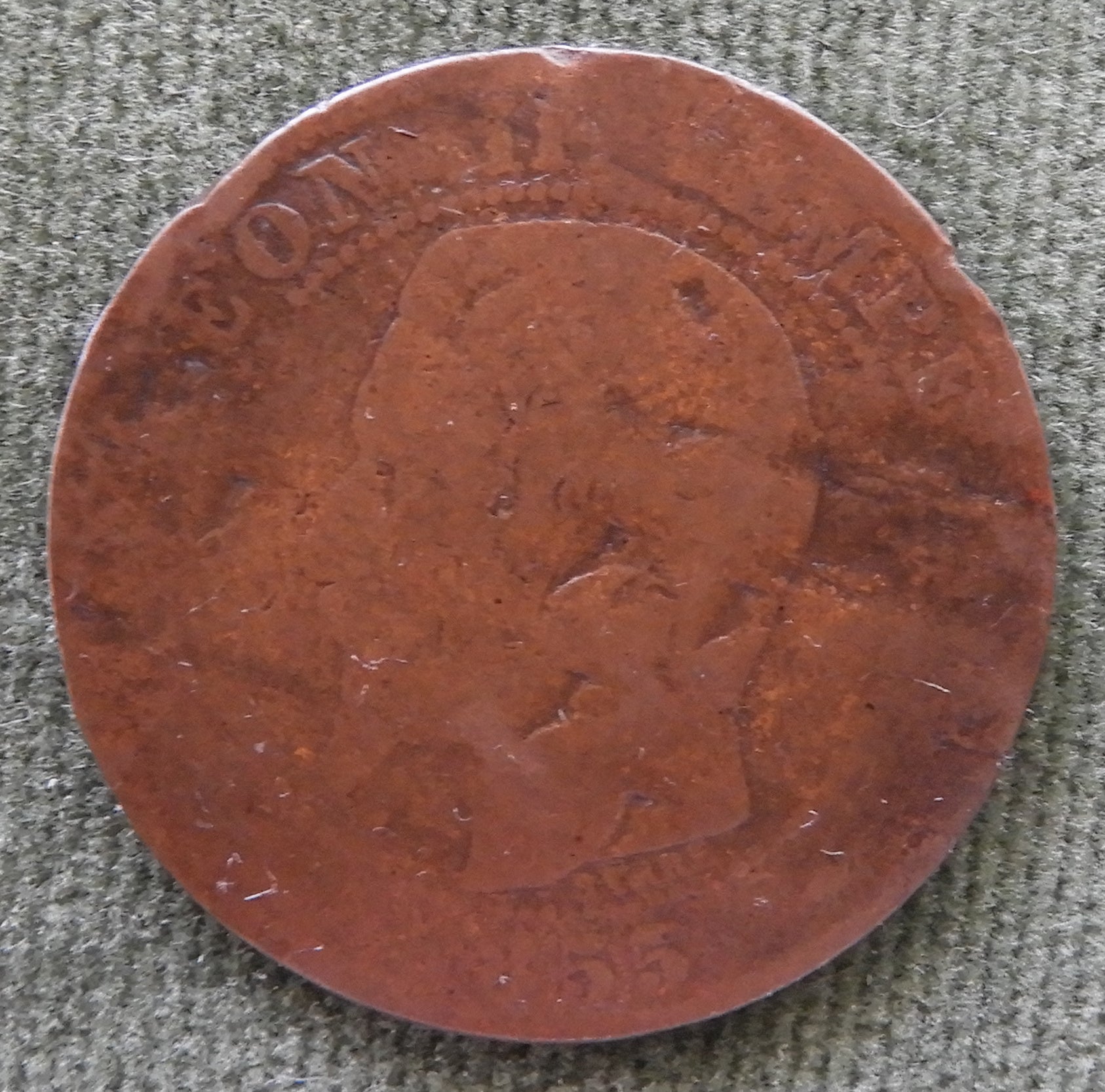 France 1855 5 Centimes Napoleon III Coin - Worn. A fair to good coin with burnished detail consistent with longer term circulation and constant handling with an illegible mint mark. Please view images as all images shown are of the actual item.