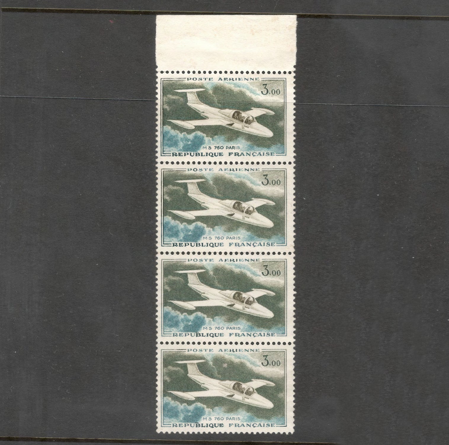France 1960 3.00 Franc MS 760 Paris Airplane Multicoloured Airmail Stamp Strip. An unused vertical stamp strip of 4 with salvage having disturbed gum from a collection that stuck together. Please view images as all images are of the actual item.