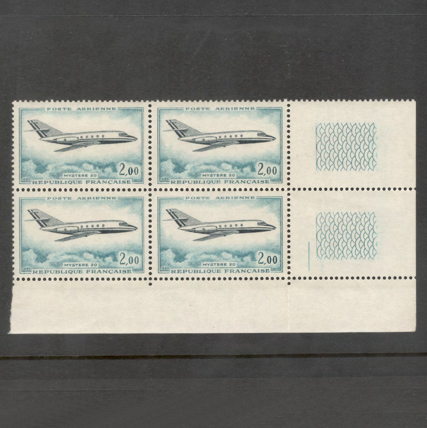 France 1965 Mystere 20 Airplane Greenish Blue Airmail Stamp Block. A MNH stamp block of 4 with margin & salvage. Please view images as all images are of the actual item.