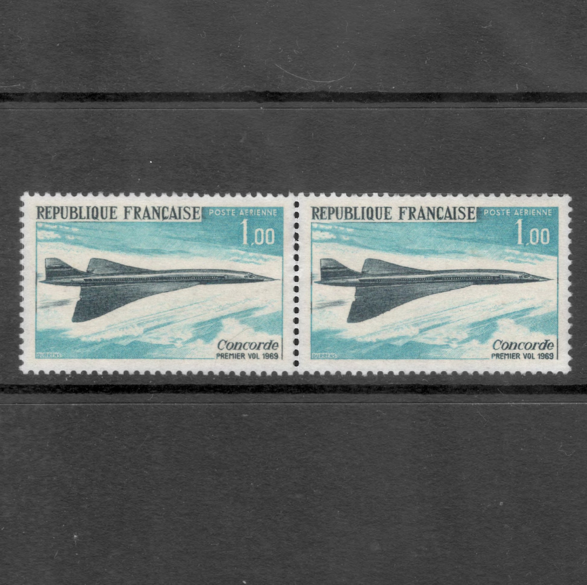 France 1969 1.00 Franc Concorde Airplane Multicoloured Airmail Stamp Pair. A MNH stamp pair with undisturbed gum. Please view images as all images are of the actual item.