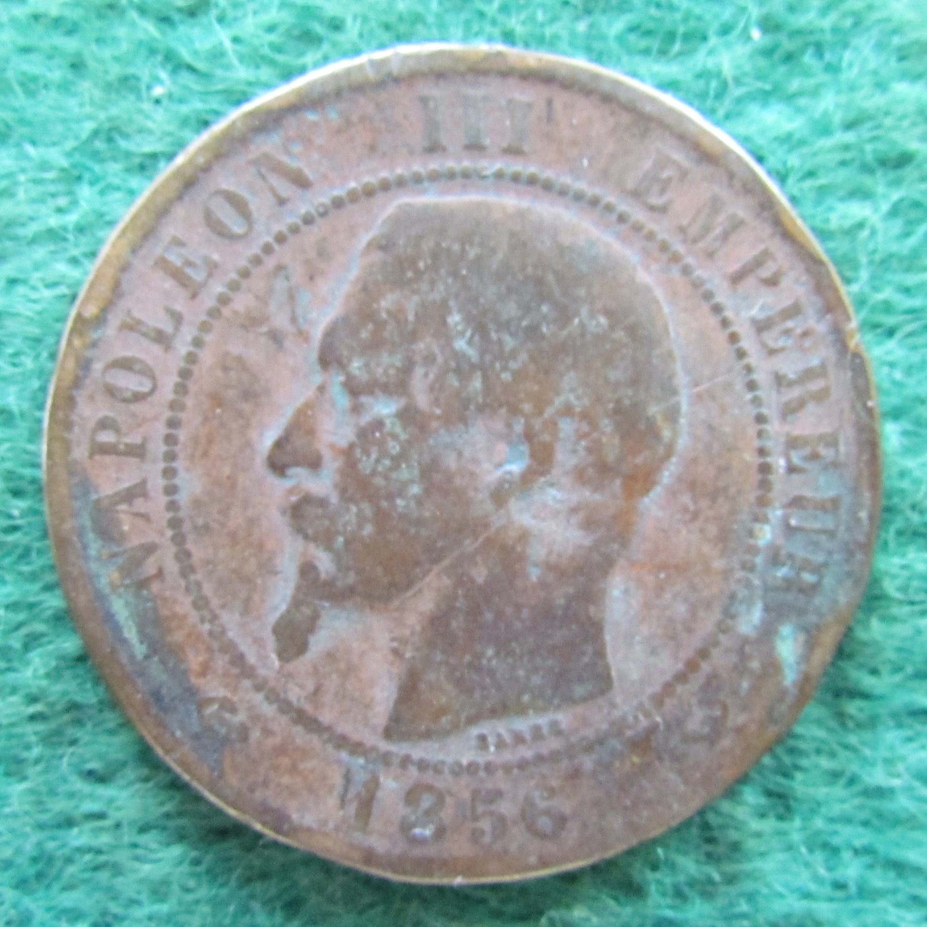 French 1856 W 10 Centimes Napoleon III Coin - Circulated. A fair to good coin showing wear consistent with long term circulation and moderate to heavy handling, please view images. All images shown are of the actual item.