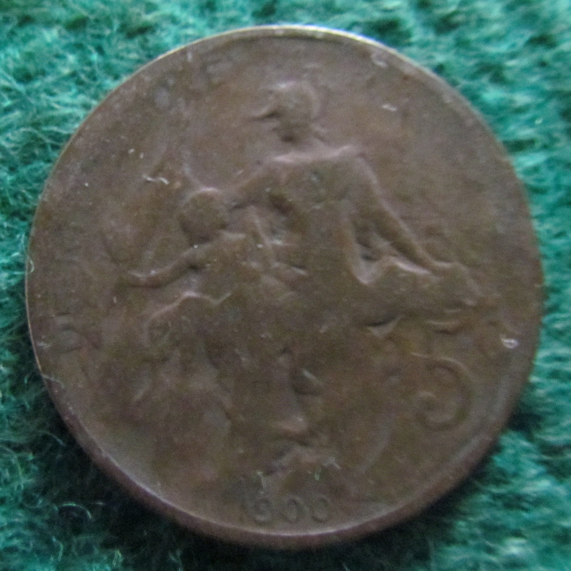 French 1900 5 Centimes Coin - Error Coin 1 In 1900 Missing. A fair to better coin showing wear consistent with heavy handling and long term circulation, 1 Missing, please view images. All images shown are of the actual coin.