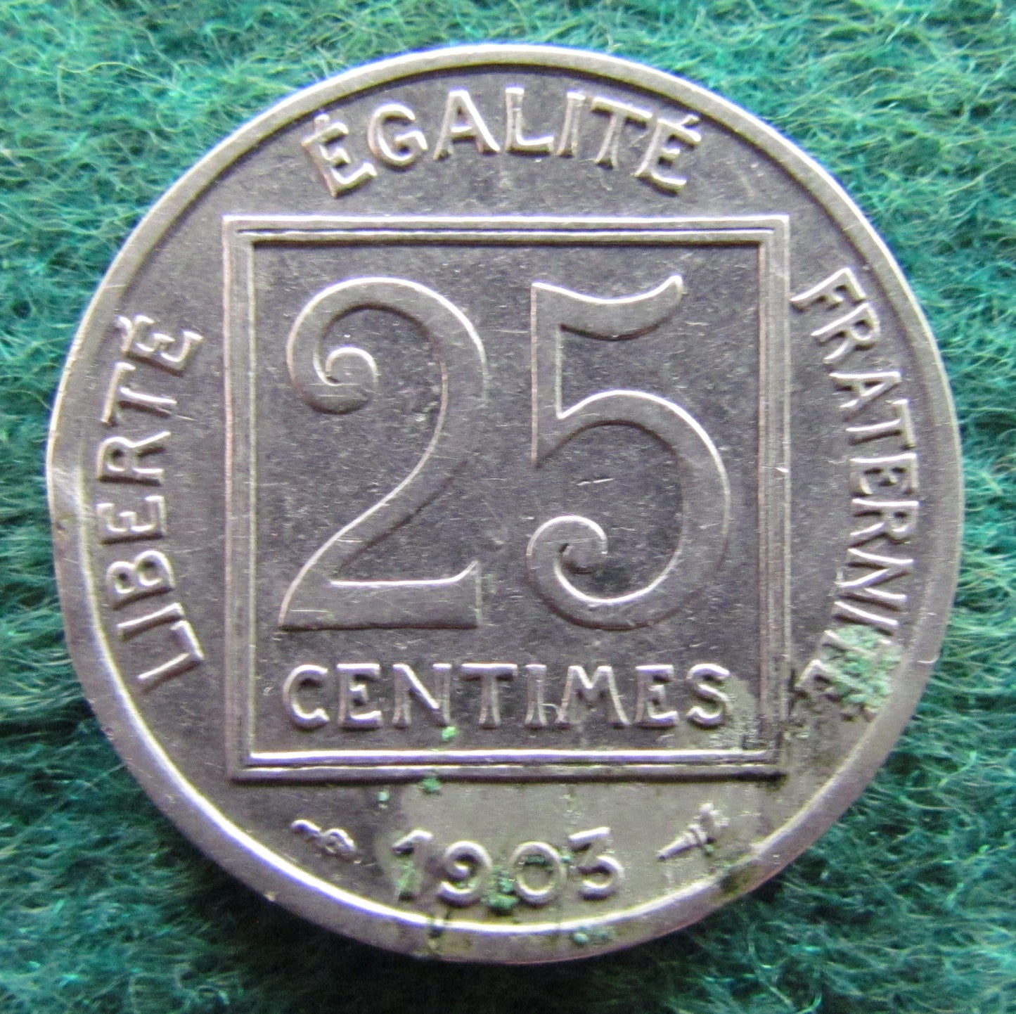 French 1903 25 Centimes Liberty Head Coin - Circulated. A fair to good coin showing wear consistent with moderate circulation and handling having corrosion on the reverse face and rim with a rim hit, please view images. All images shown are of the actual item.
