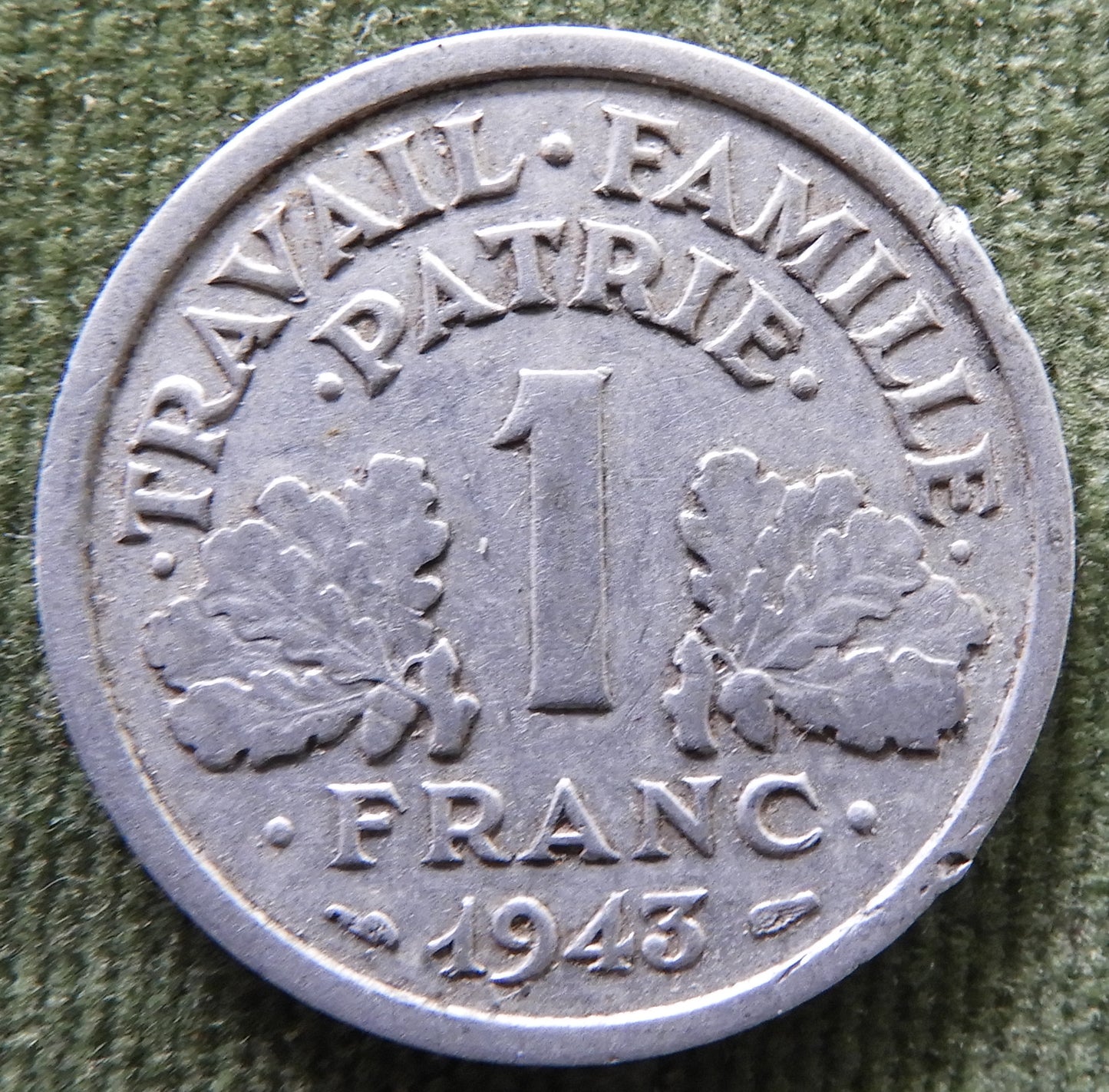 French 1943 1 Franc Coin - Circulated. A fair to good coin showing wear consistent with moderate to heavy handling in long term circulation, please view images. All images shown are of the actual item.