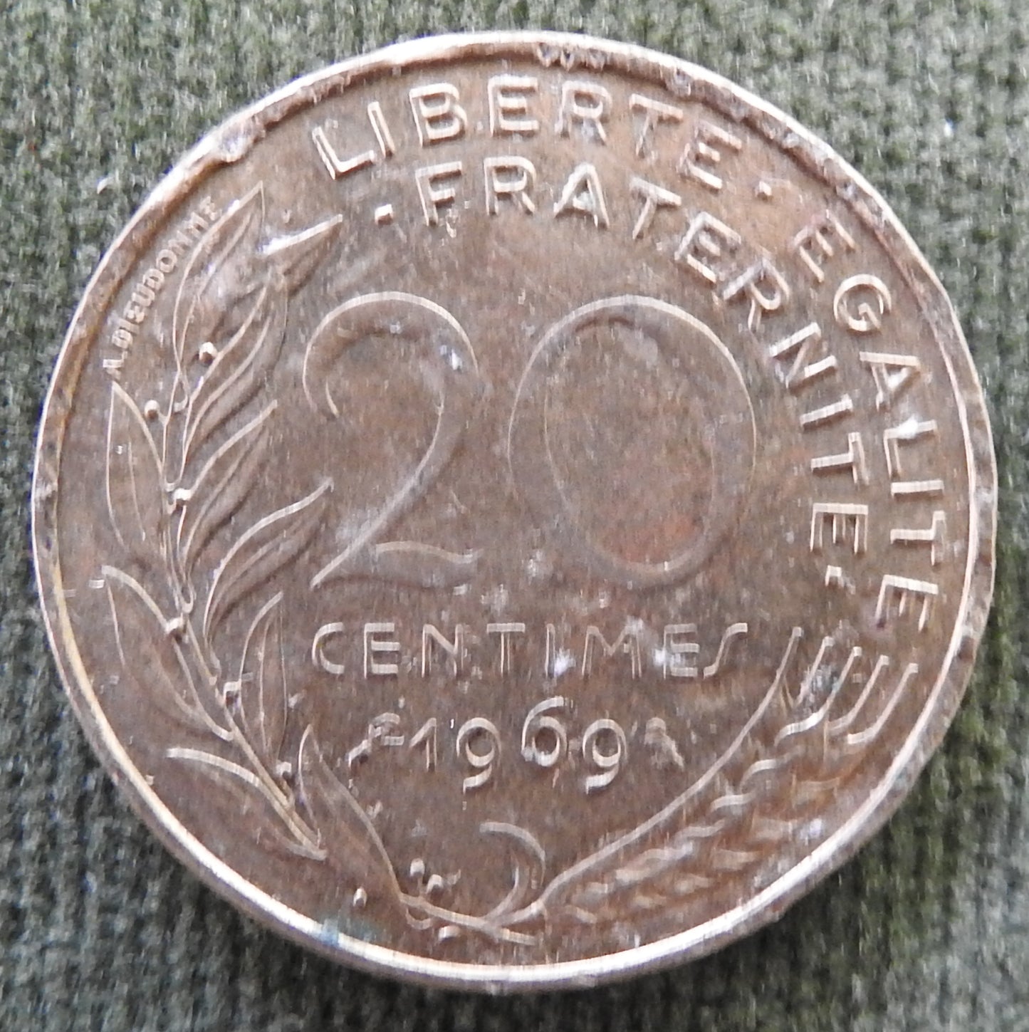 French 1969 20 Centimes Coin - Circulated. A fair to better coin showing wear consistent with moderate handling in circulation with rim hit & deep abrasions. Please view images as all images shown are of the actual item.
