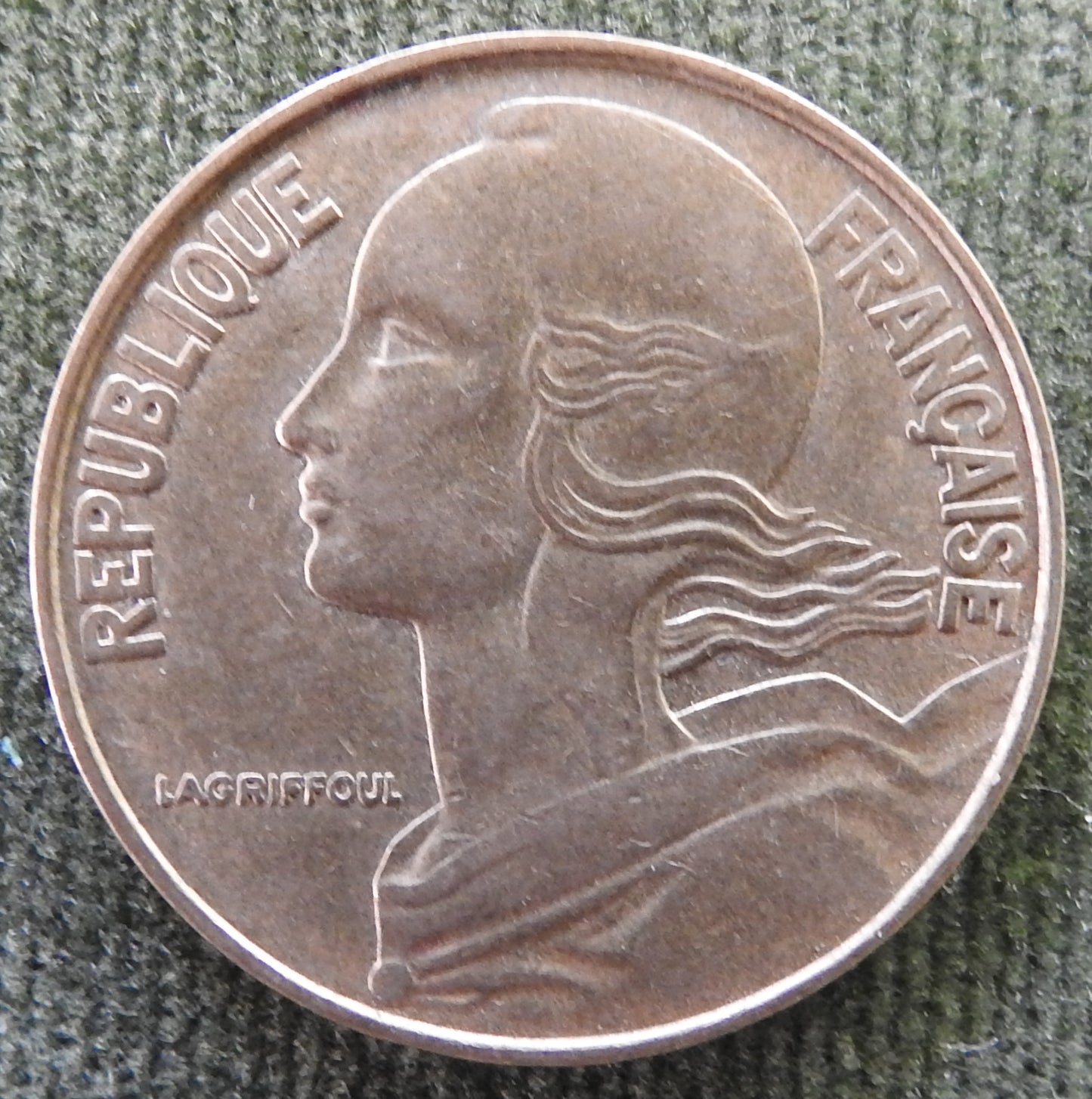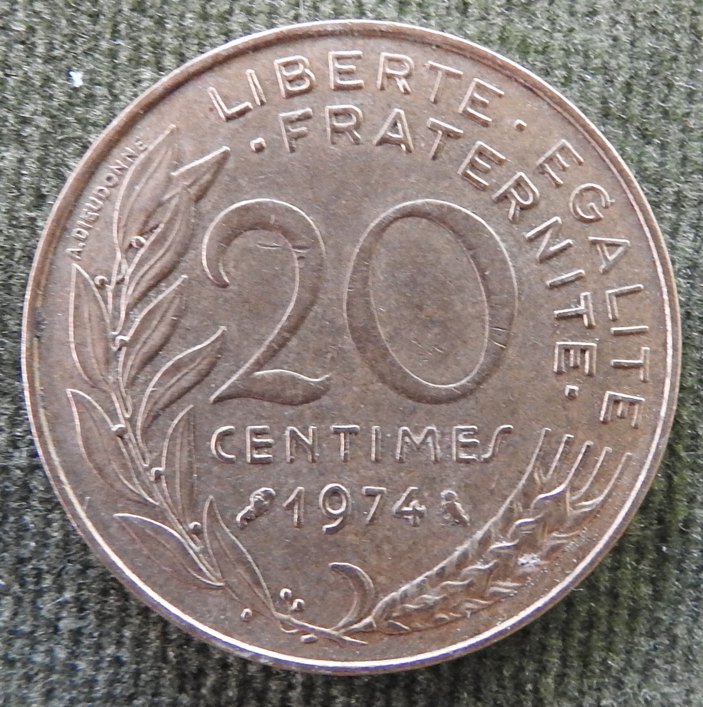 French 1974 20 Centimes Coin - Circulated. A good to better coin showing wear consistent with light handling in circulation. Please view images as all images shown are of the actual item.