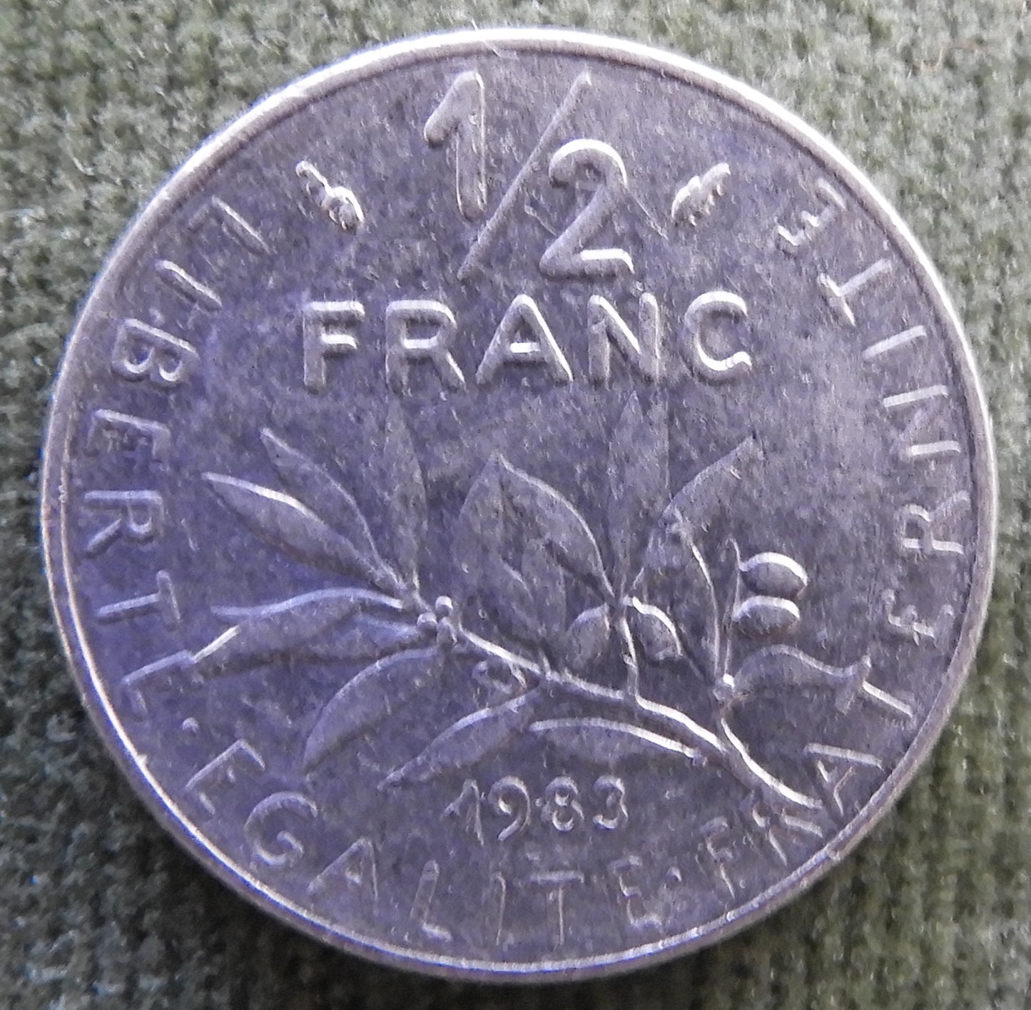 French 1983 1/2 Franc Coin - Circulated. A good coin showing wear consistent with light to moderate handling in circulation, please view images. All images shown are of the actual coin.