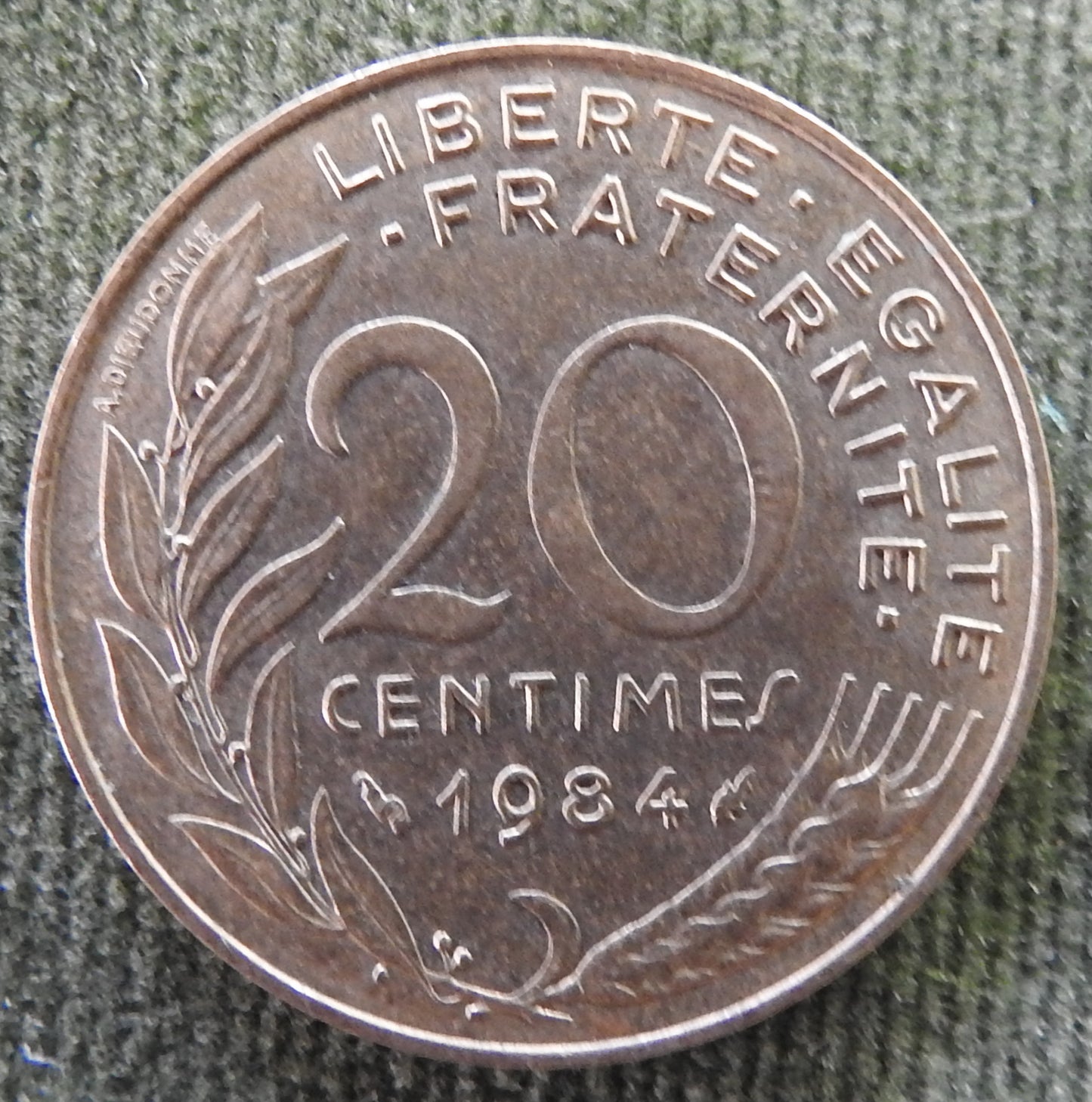 French 1984 20 Centimes Coin - Circulated. A good to better coin showing wear consistent with light handling in circulation. Please view images as all images shown are of the actual item.