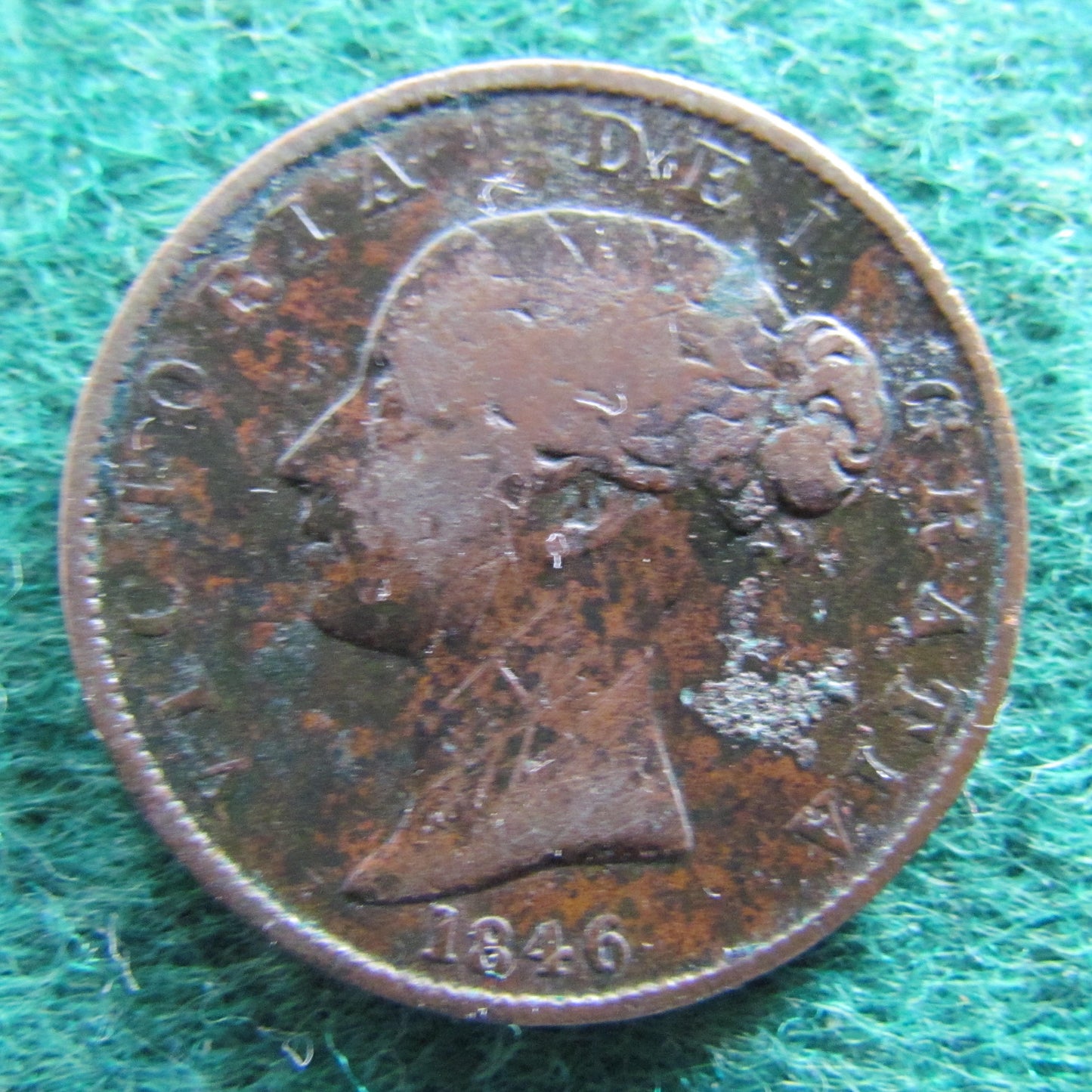 GB British UK English 1846 Half Penny Queen Victoria Coin - Young Head. A good condition coin showing wear consistent with a moderate to long term in circulation and moderate handling having some corrosion, please view images. All images shown are of the actual item.