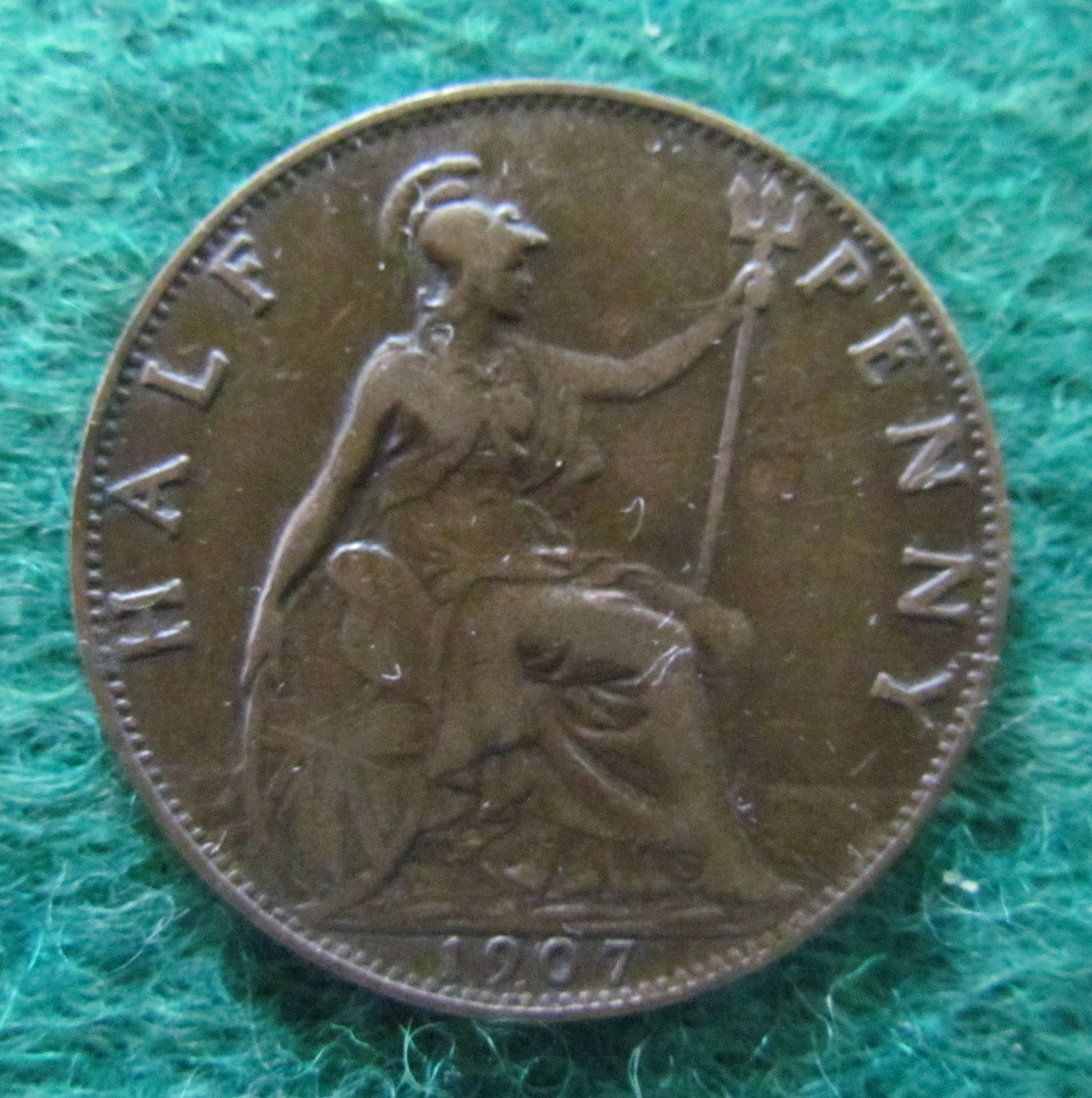 GB British UK English 1907 Half Penny King Edward VII Coin Circulated. A good example showing wear & colouring consistent with short term removal from circulation, please view images. All images shown are actual item.