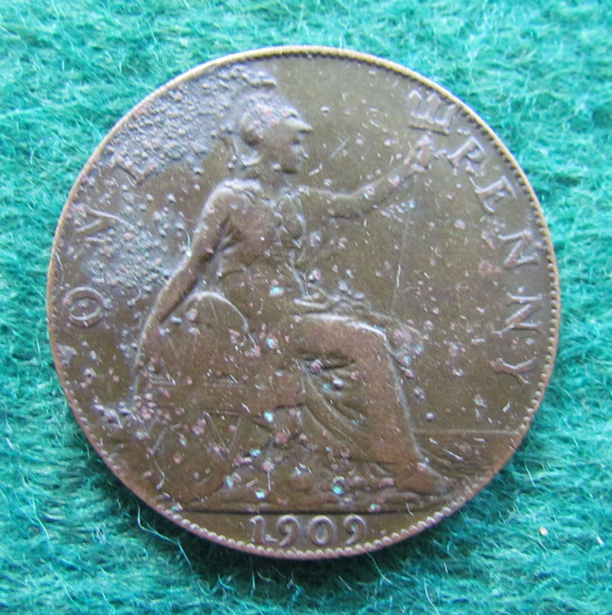 GB British UK English 1909 Penny King Edward VII Coin Circulated. A good example showing wear and colouring consistent with pre term removal from circulation, with blistering, please view images. All images shown are actual item.