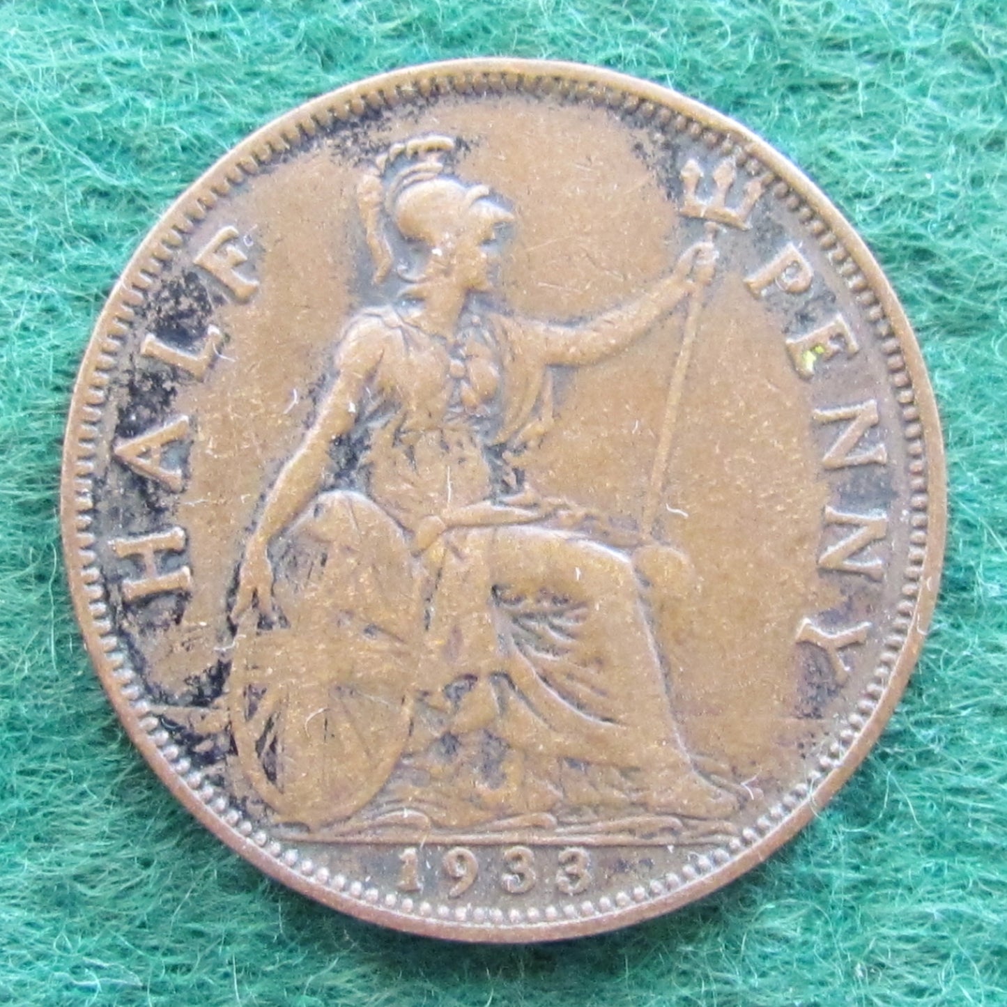 GB British UK English 1933 Half Penny King George V Coin. A good coin showing wear consistent with moderate to long term circulation and moderate to heavier handling, please view images. All images shown are of the actual item.