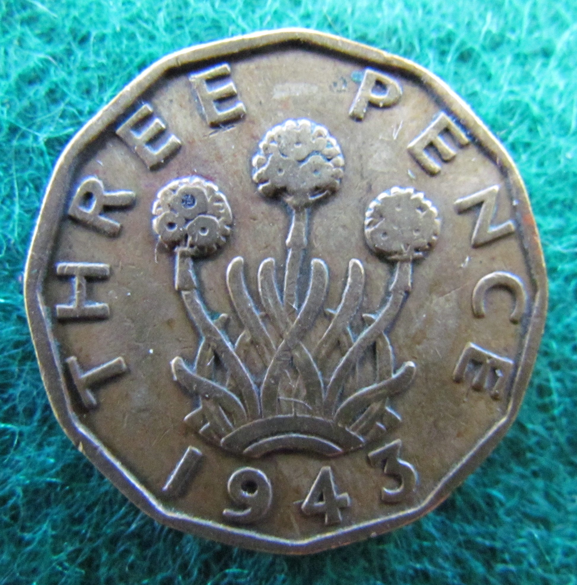 GB British UK English 1943 Threepence King George VI Coin. All images shown are actual coin.