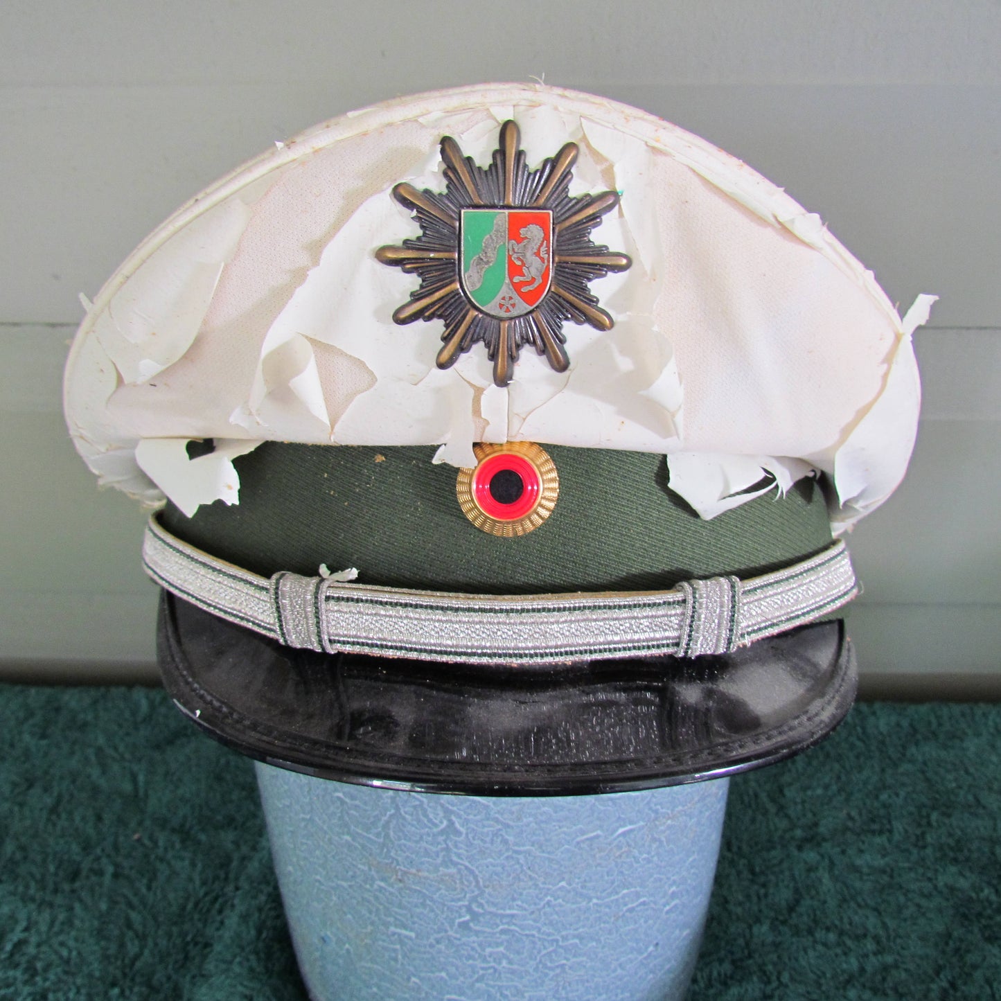German Police Officers Visor Cap White Leather Simulate. An authentic vintage German Police cap 3/97, Now retired but very poor condition with peel on the outer membrane, The exterior fabric is unsalvageable. Please view Images, size 58. Please view images as all images are of the actual item. Please note the cap has been priced on the value of salvage of the badges and anything other than the upper, happy to break it down for less expensive shipping.