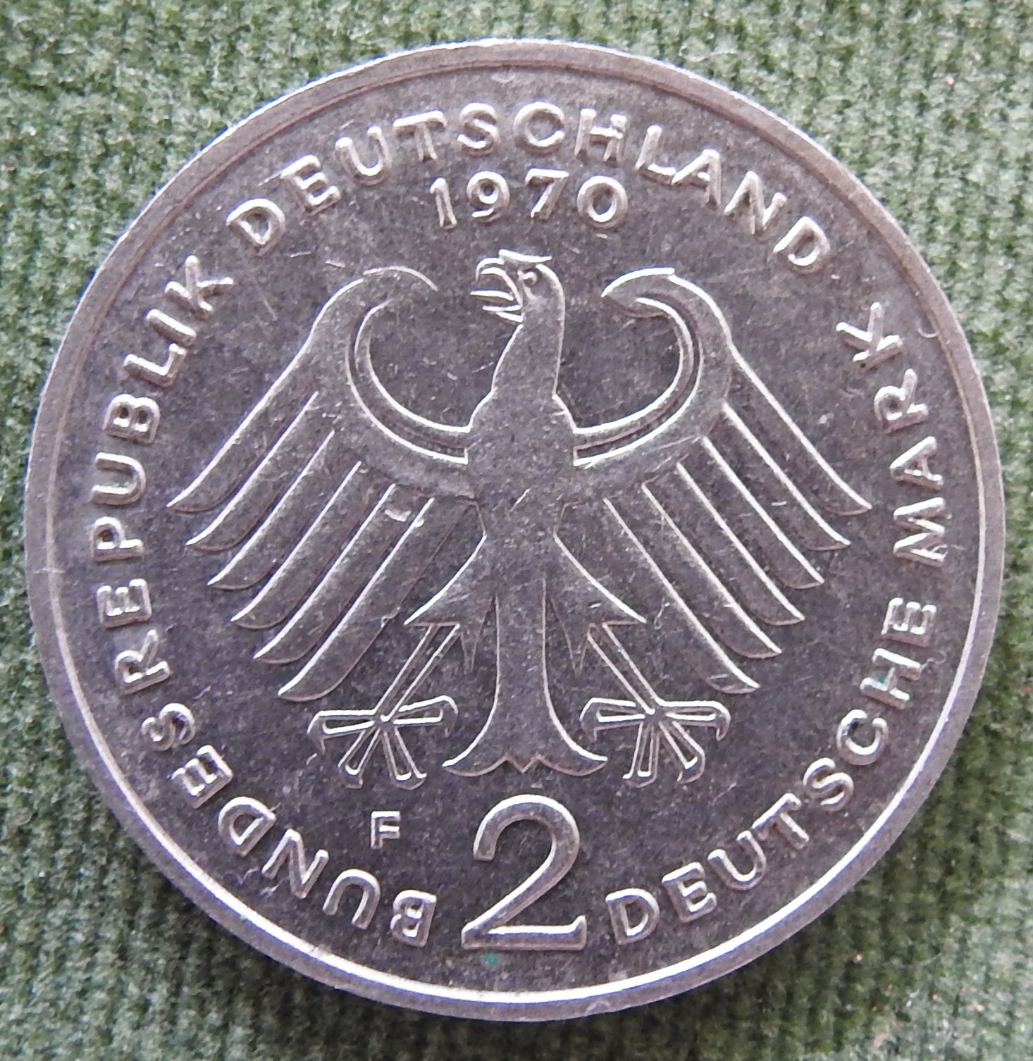Germany 1970 F 2 Deutsche Mark Konrad Adenauer Coin. A good coin showing wear consistent with a moderately handled circulated coin. Please view images as all images are of the actual item.
