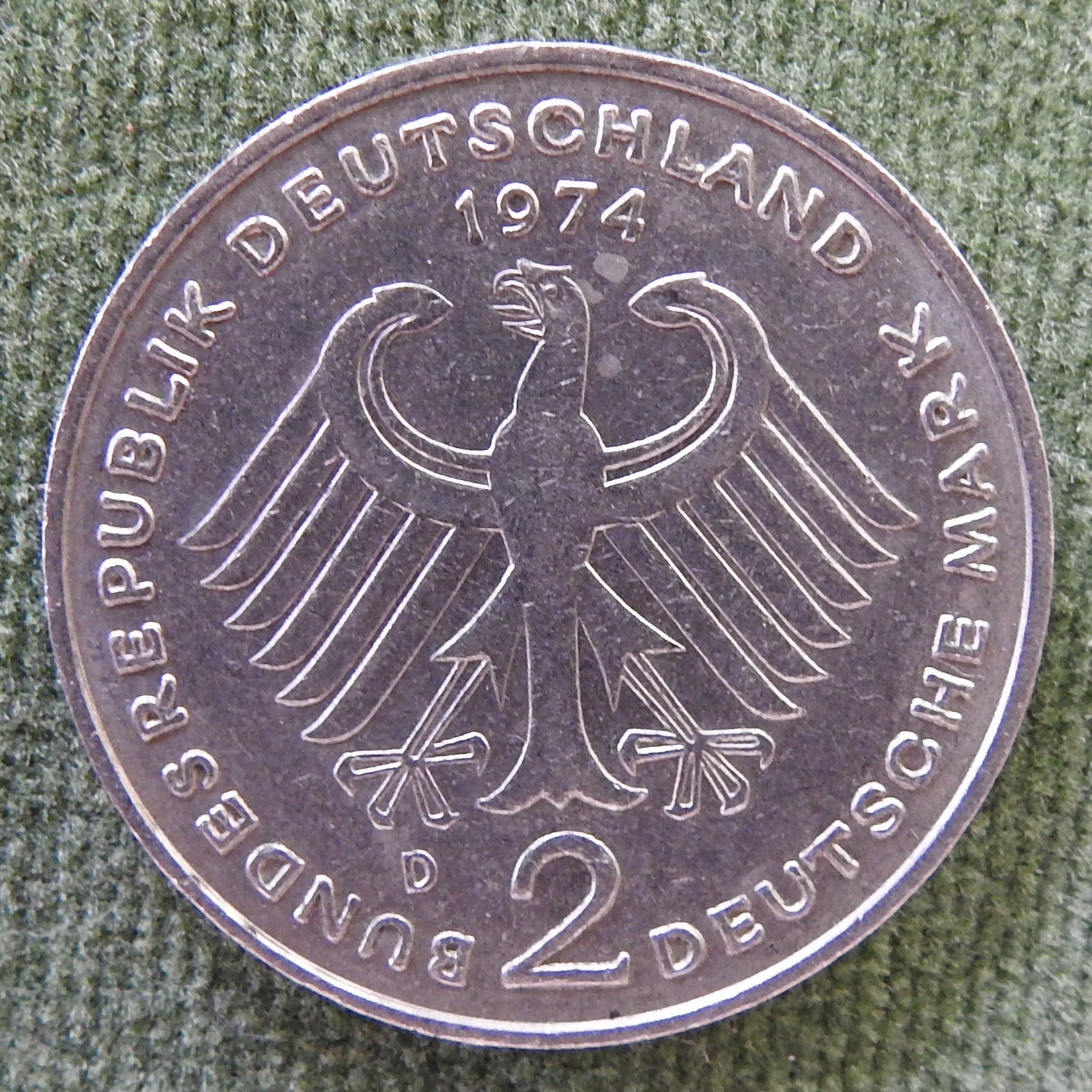 Germany 1974 D 2 Deutsche Mark Coin Konrad Adenauer