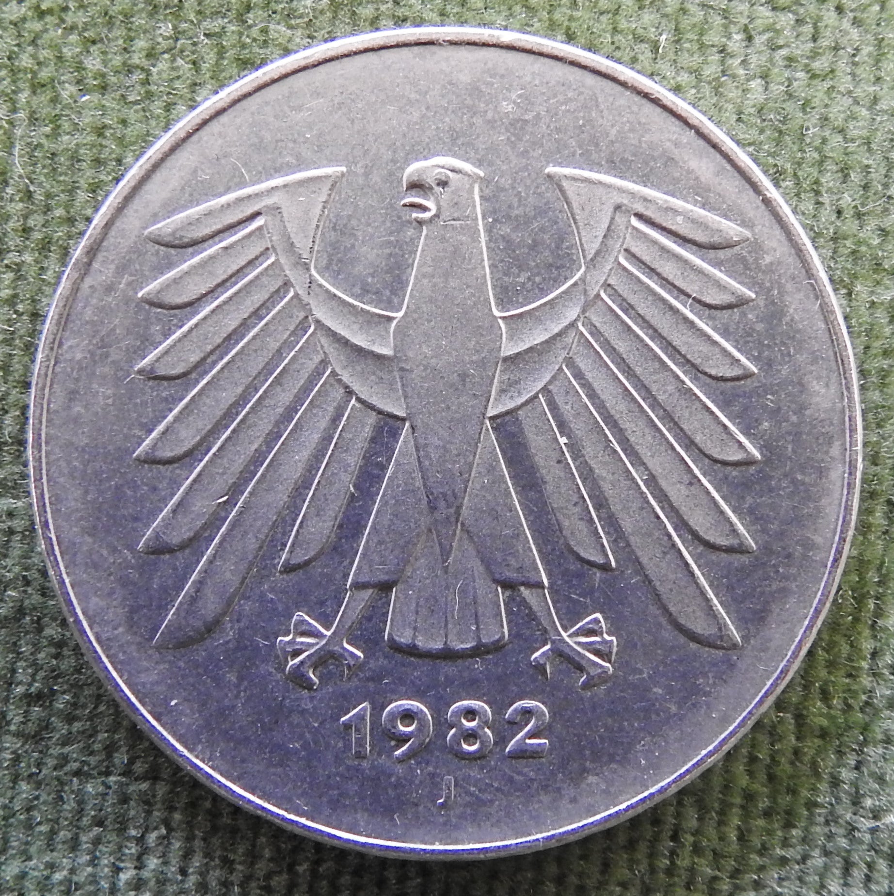 Germany 1982 J 5 Deutsche Mark Coin - Circulated. A good coin showing wear consistent with short to moderate term circulation and handling. Please view images as all images shown are of the actual item.