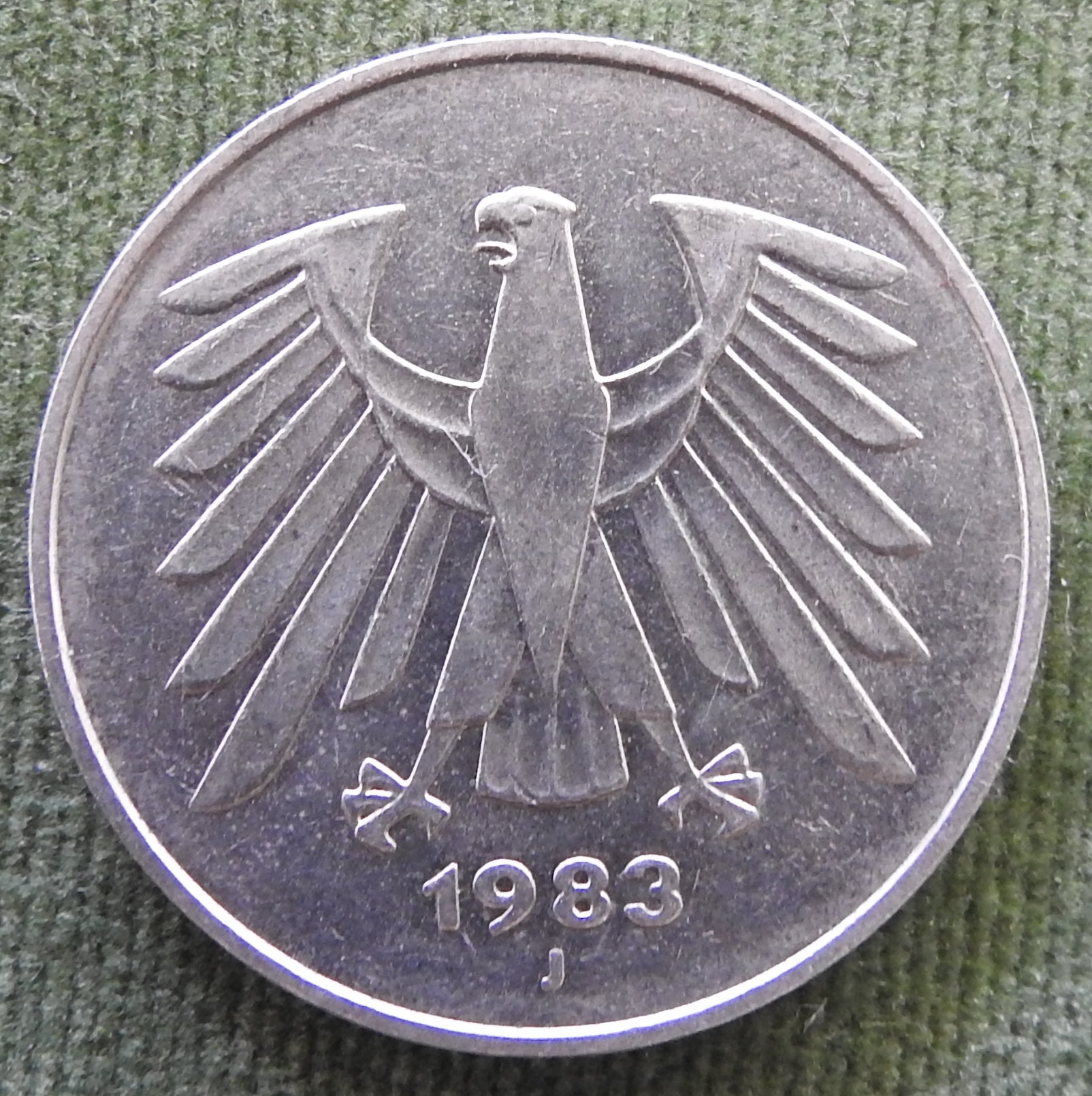 Germany 1983 J 5 Deutsche Mark Coin - Circulated. A good coin showing wear consistent with short to moderate term circulation and handling. Please view images as all images shown are of the actual item.