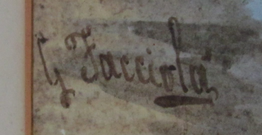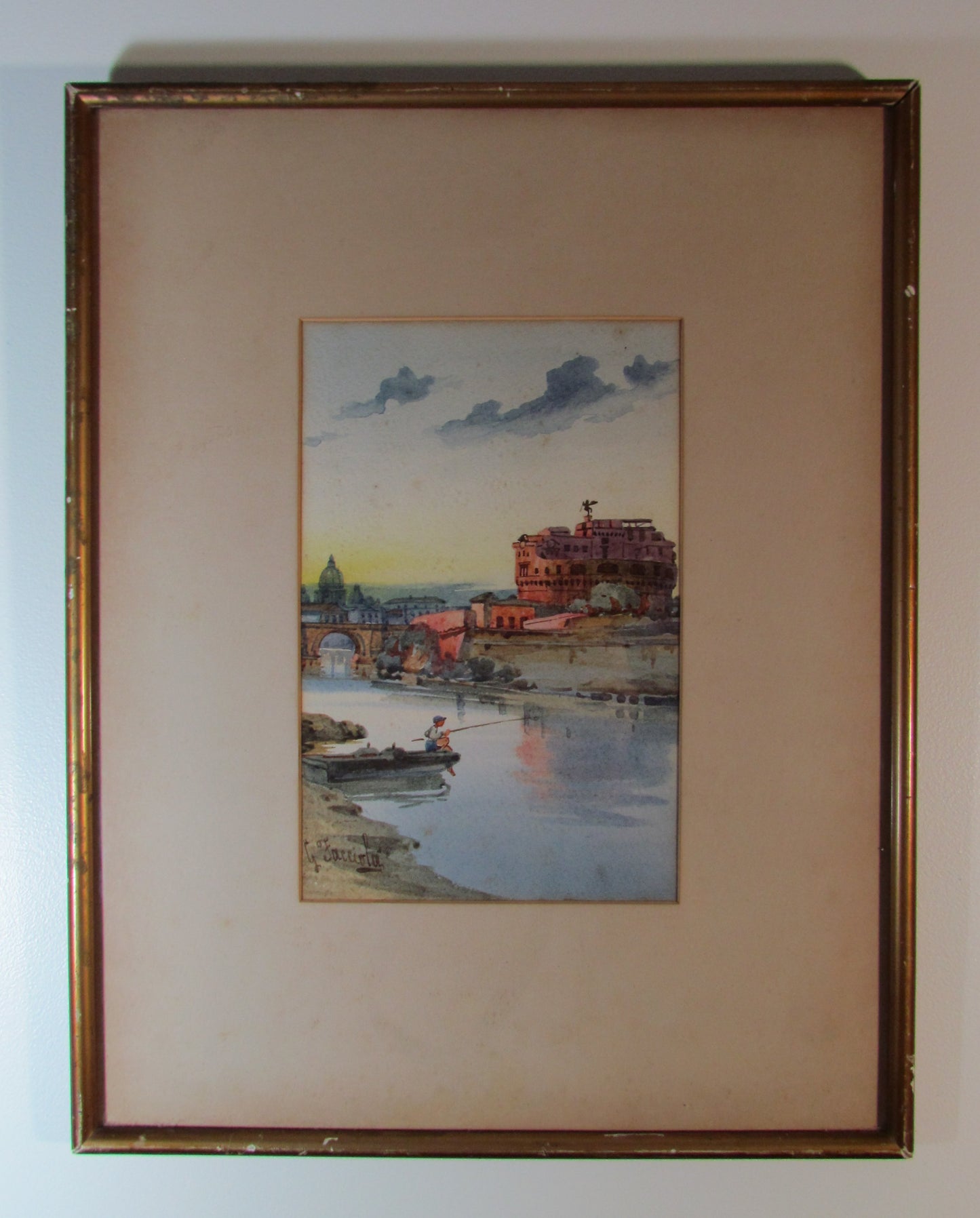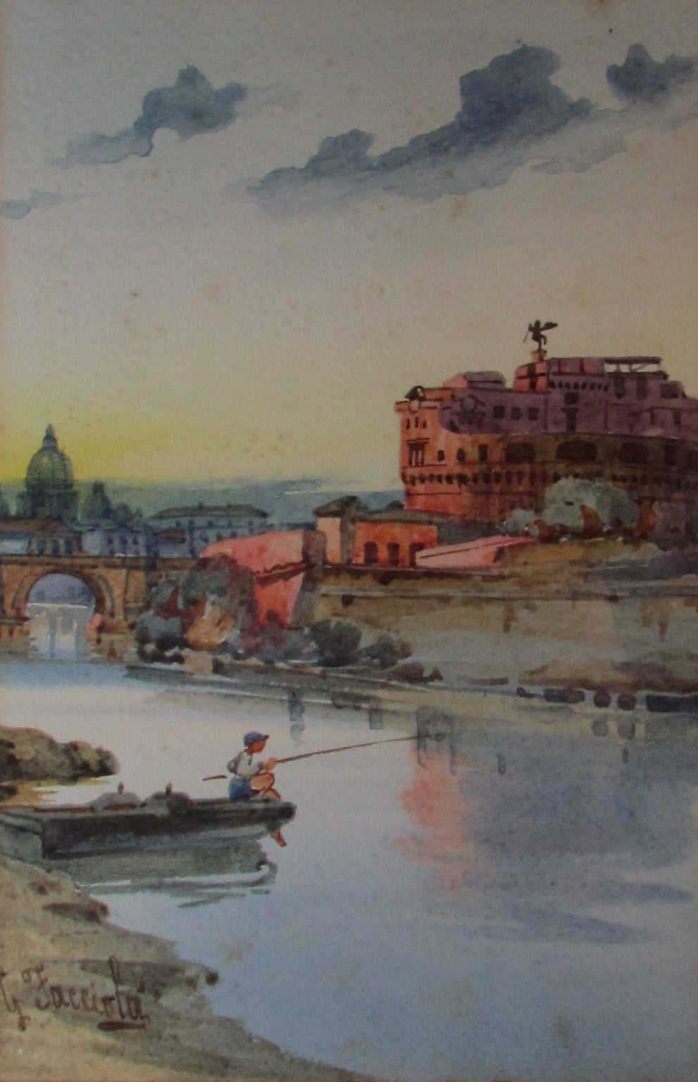 Giovanni Facciola Watercolour. An untitled watercolour depicting a river and ruins in the background with a fisherman sitting on a barge. There are many similar paintings by the Italian artist that indicate the view is near to Rome, having some fauxing and in need of a little maintenance. Please view images as all images are of the actual item.
