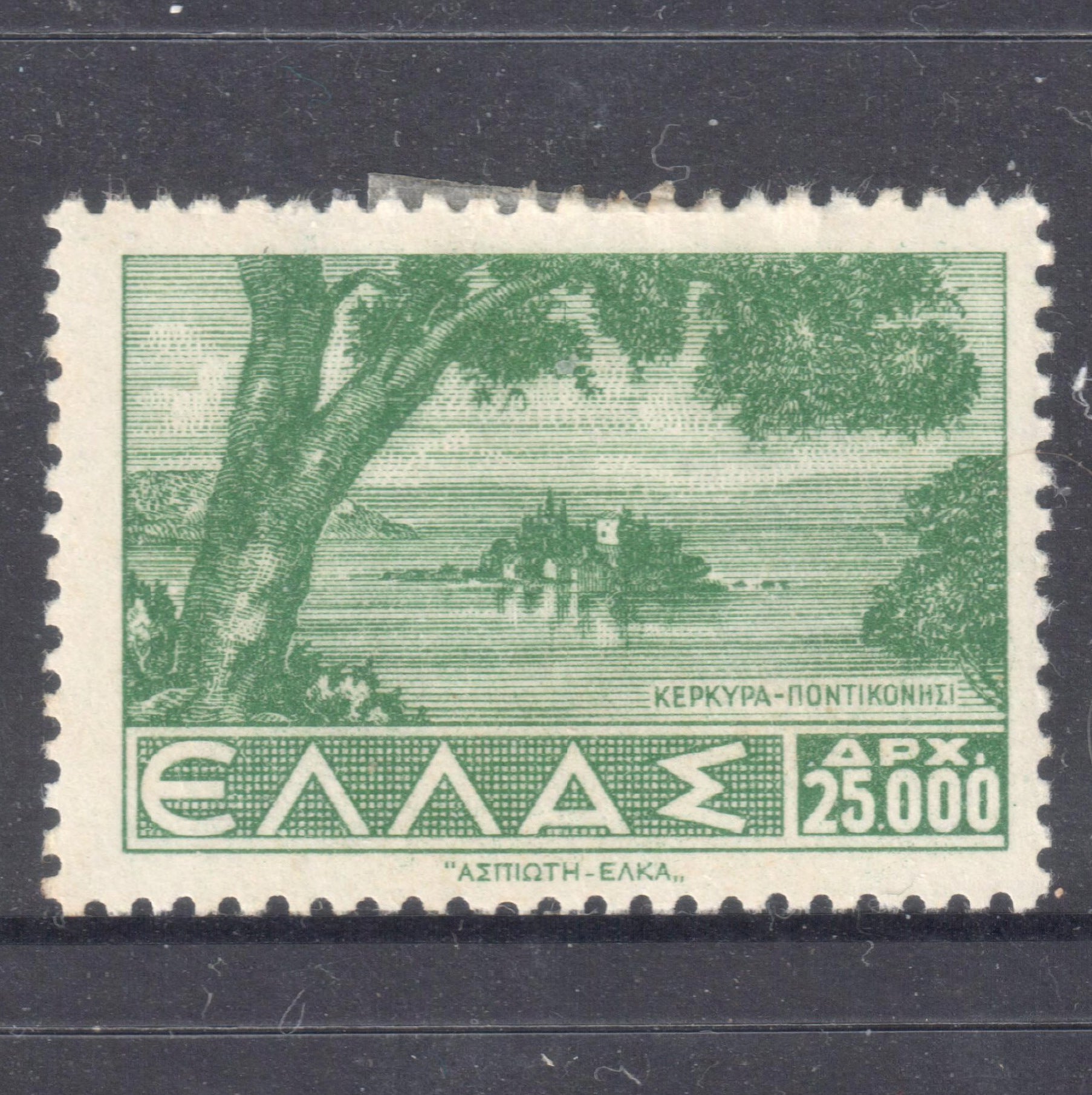 Greek 1943 25000 Drachma Green Landscapes Stamp - Perfin:12.5. A fine unused mounted stamp with partial hinge. Please view images as all images are of the actual item.