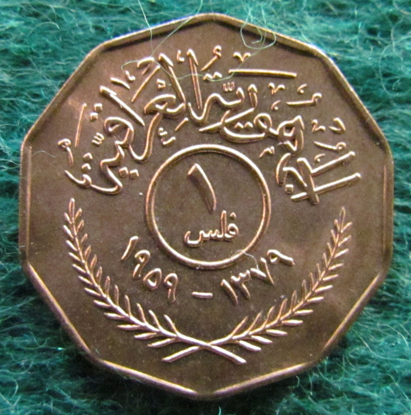 Iraq 1959 1 Fil Coin AH 1379 - Circulated. A good coin showing wear consistent with early removal from circulation. Please view images as all images are of the actual item.