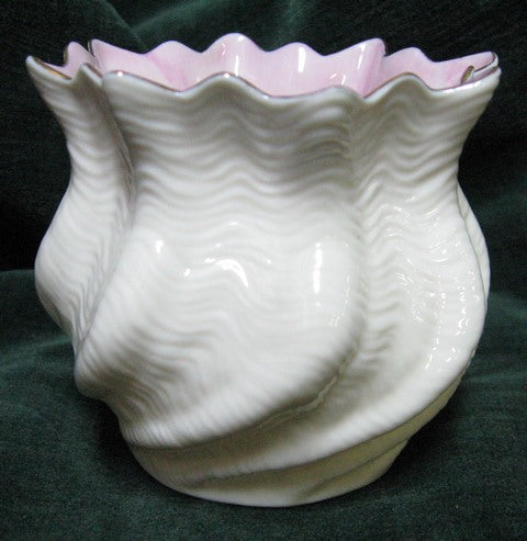 Irish Belleek shell vase with white opalescent body and pink/mauve inner rim with gilt edge with a brown backstamp. Please view images as all images are of the actual item.