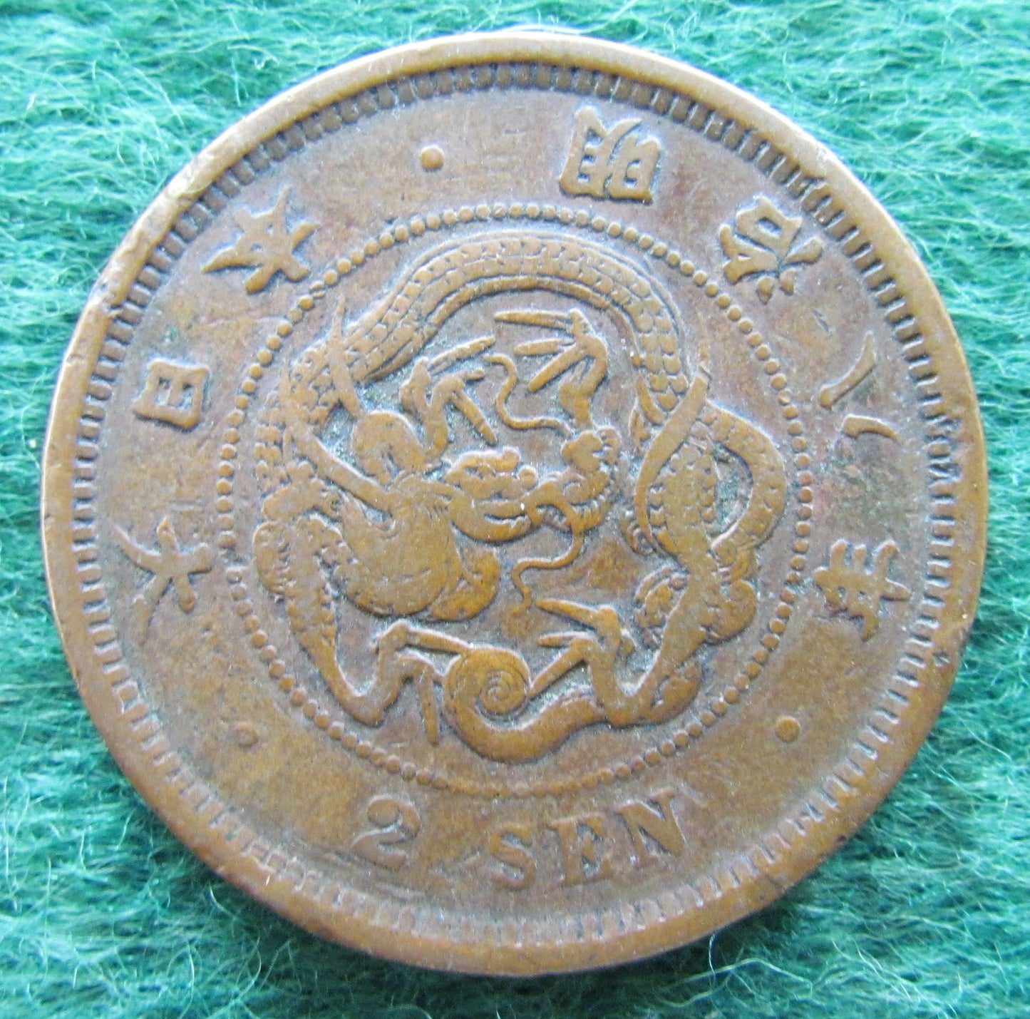 Japanese 1875 2 Sen Coin - Circulated. A fair to good coin showing wear consistent with a medium to long period in circulation and moderate to heavy handling. Please view images as all images shown are of the actual item.