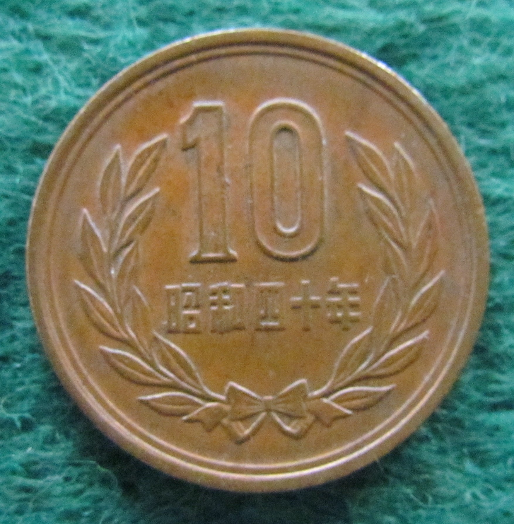 Japanese 1965 10 Yen Coin - Circulated. A good coin showing wear consistent with a moderate period in circulation and moderate handling. Please view images as all images shown are of the actual item.