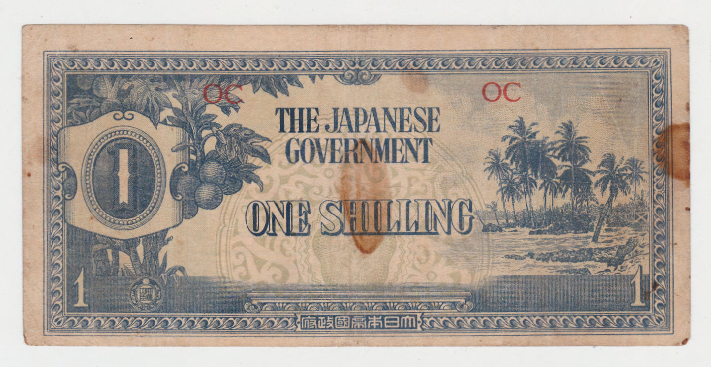 Japanese Oceania Occupation Currency 1 Shilling Banknote. This note has been folded, creased, with some stains & discolouration, literally through the wars. Please view images as all images are of the actual item.