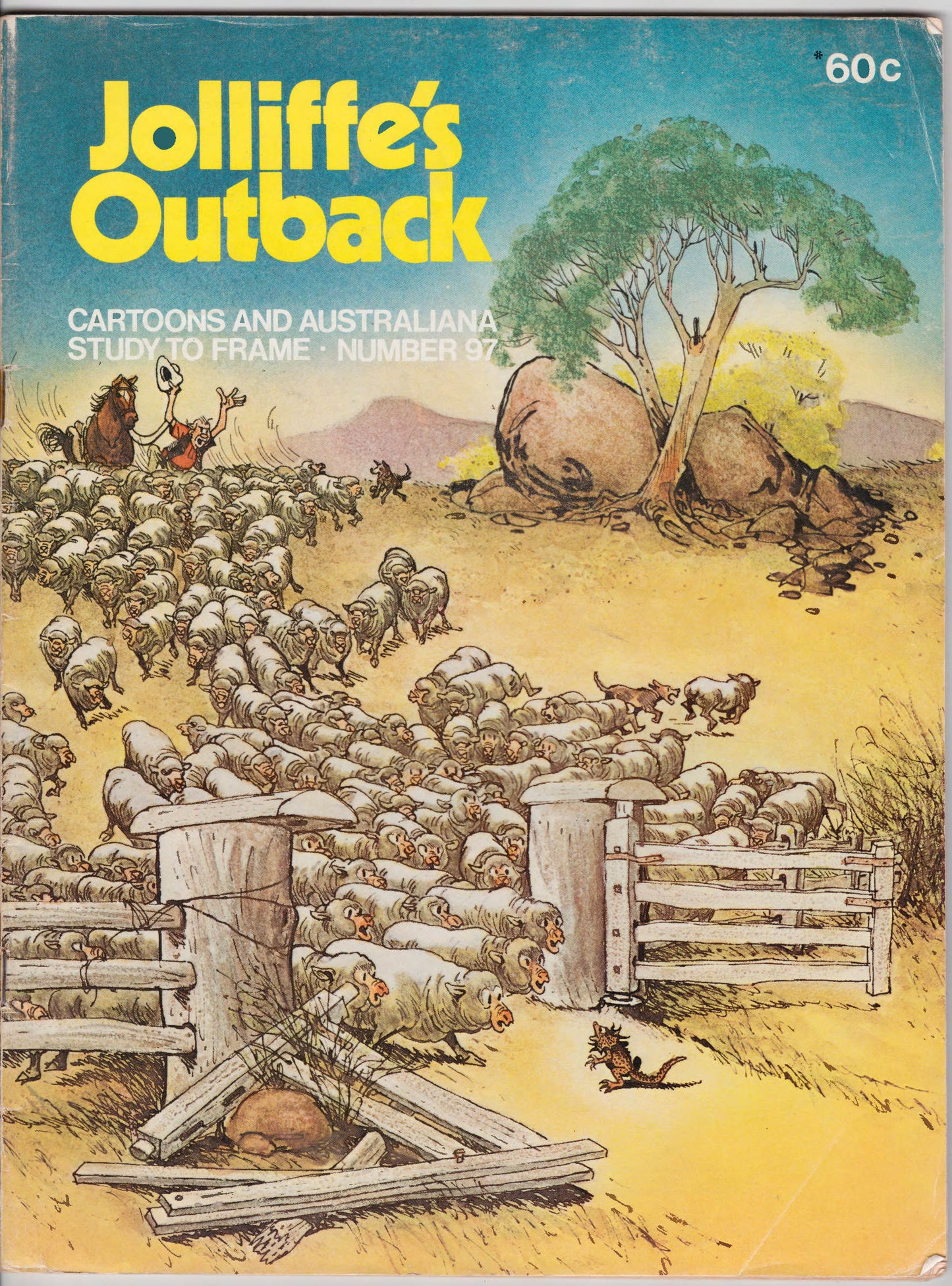 Jolliffe's Outback Cartoons And Australiana Study To Frame - Number 97. A hard to find edition with creasing, ripples, folds, bumped corners, it has been well read over and over. All images are of the actual item.