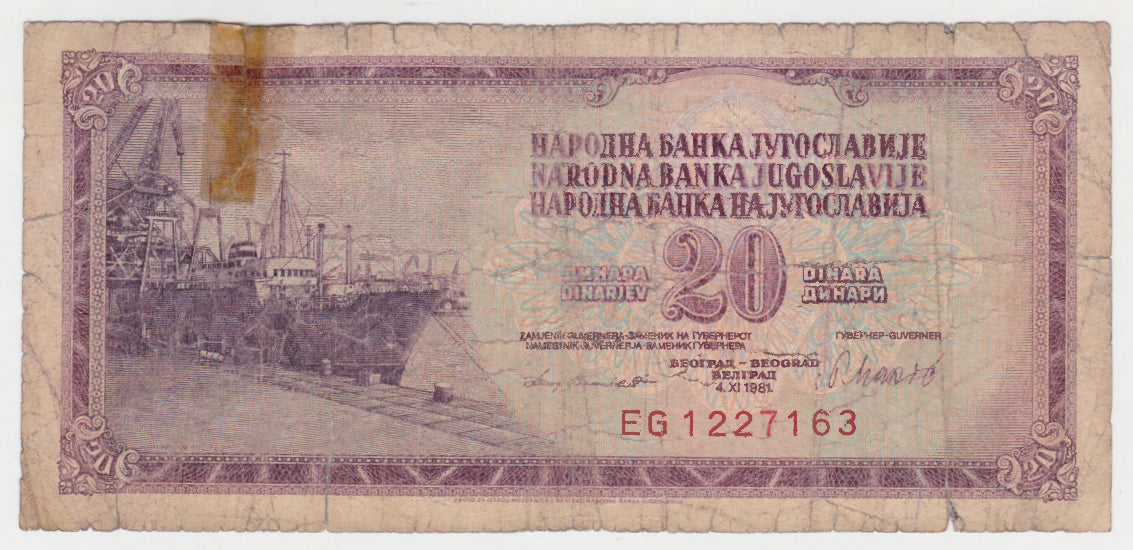 Jugoslavia 1981 20 Dinar Banknote s/n EG1227163 - Circulated