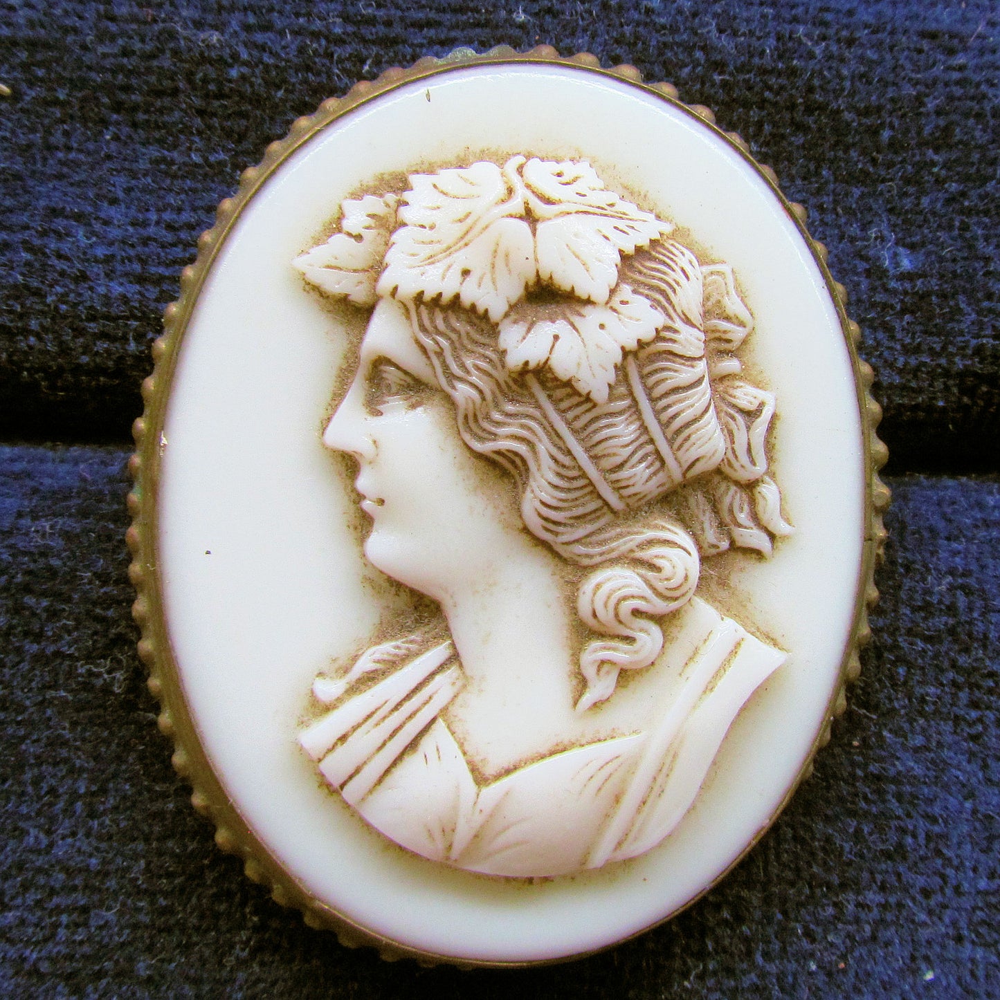 German 1930's Milk Glass Cameo Brooch Set In Yellow Metal