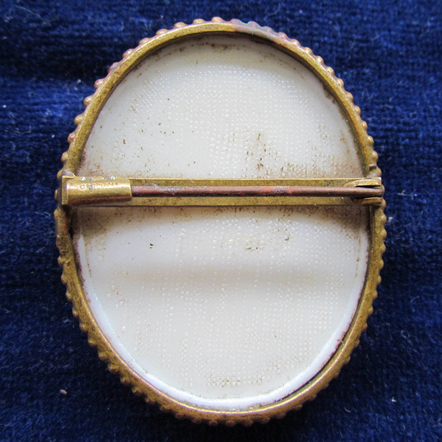 German 1930's Milk Glass Cameo Brooch Set In Yellow Metal. Please view images as all images are of the actual item.