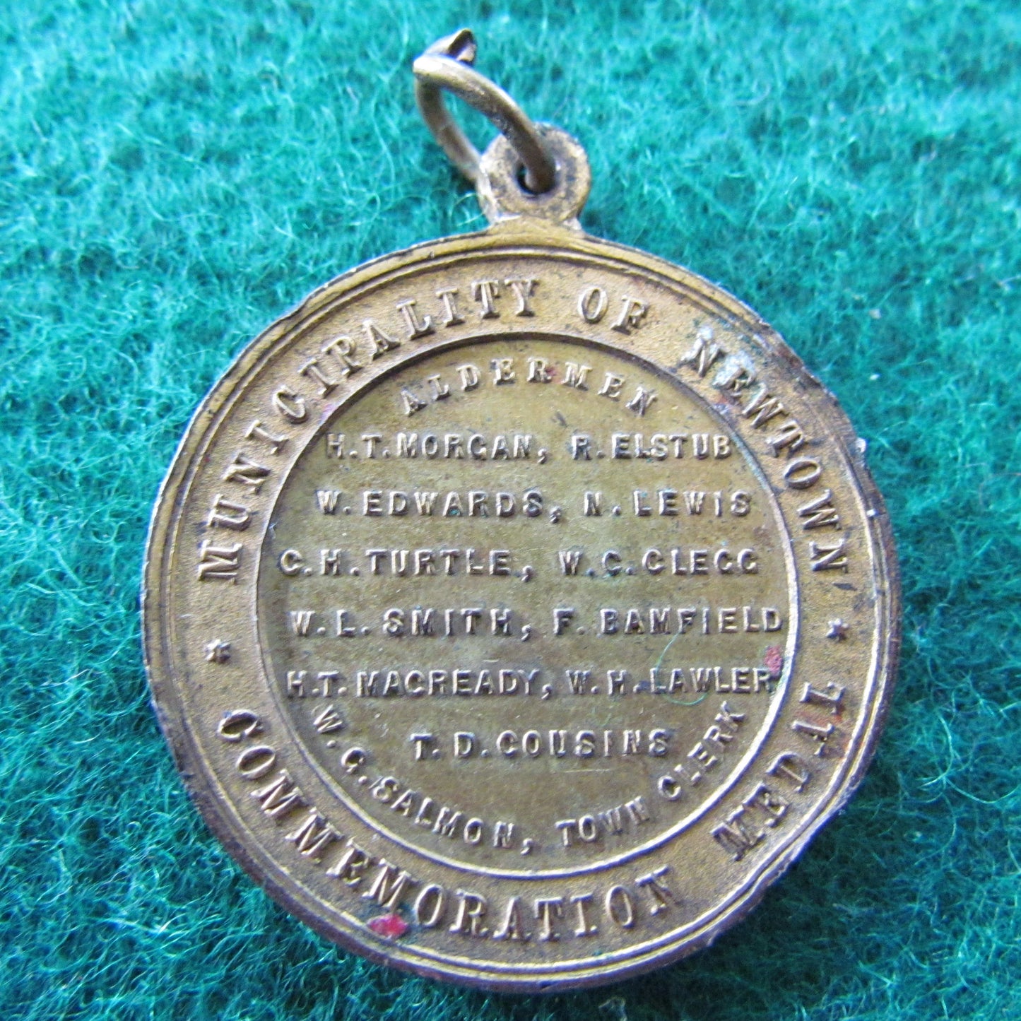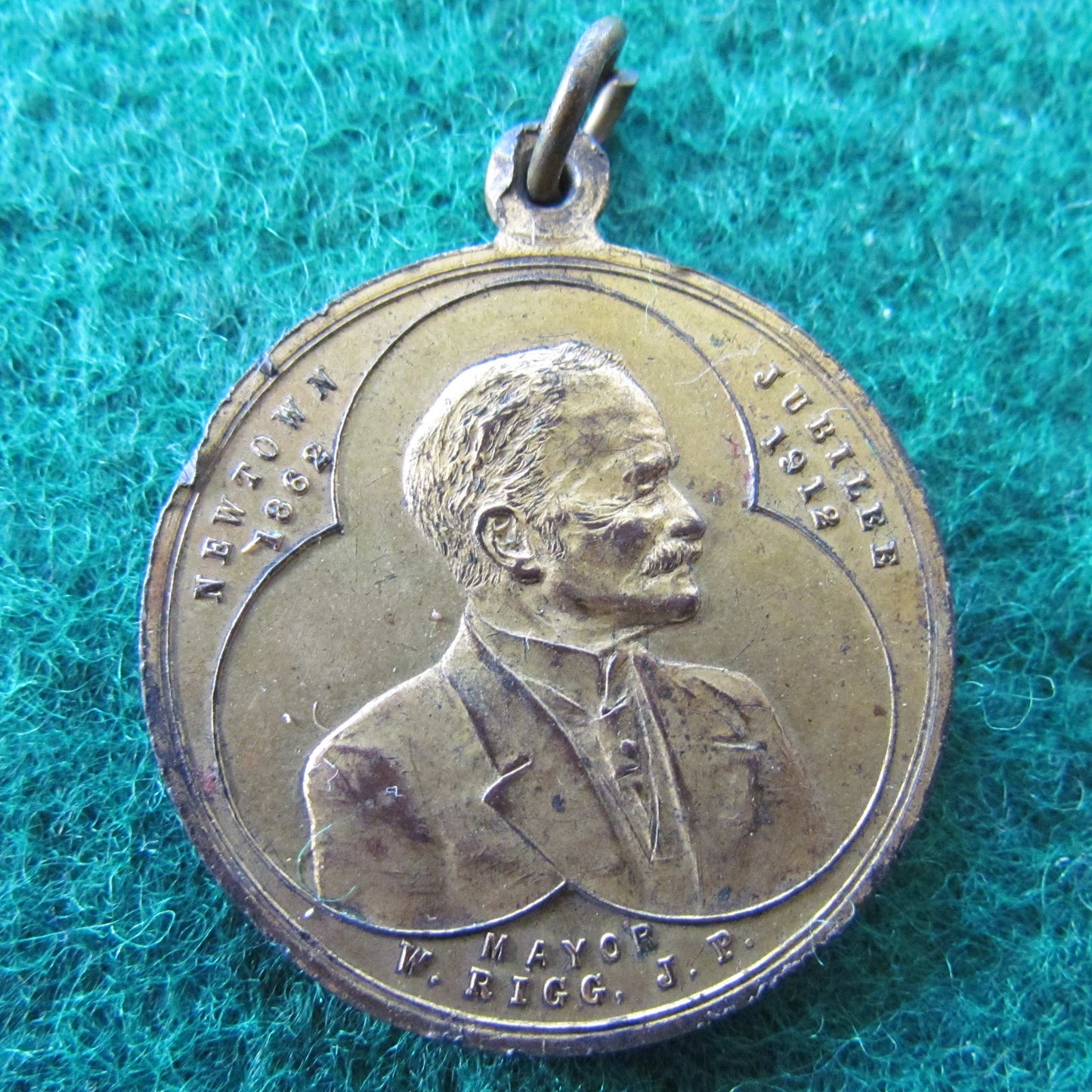 Municipality of Newtown Commemoration Medal Silver Jubilee 1862 - 1912. 1 of 5000 medals issued to schoo children in the Newtown Municipality in 1912 as part of their Silver Jubilee celebrations with benefits to the children to whom they were issued to ie free pass to the movie theatre a lunch etc.The medal is in fair condition with most of its gilding in tact but, it has been dropped and there is corrosion present.