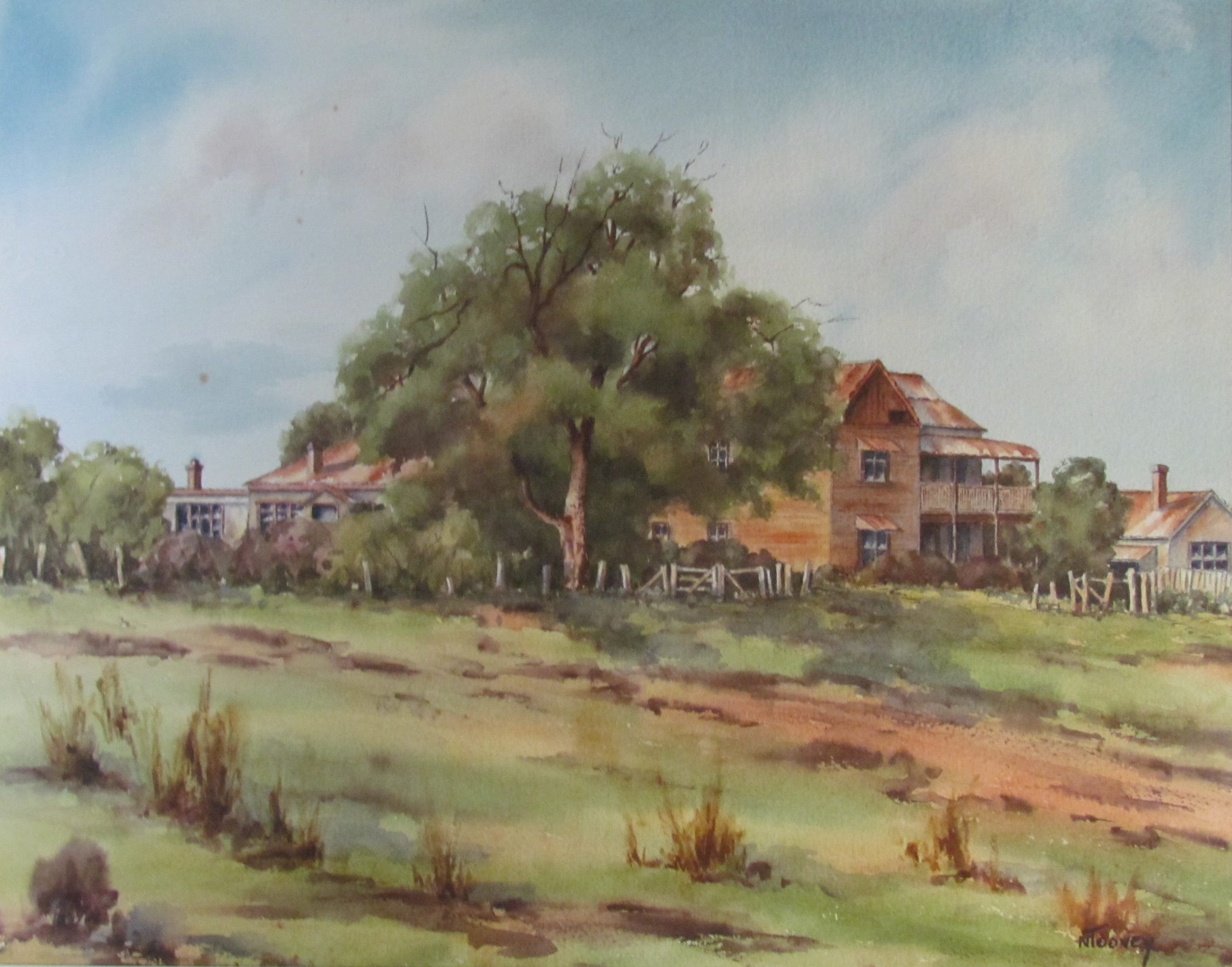 Nancy Toovey Watercolour Of A Large Homestead At Singleton 1979. An Australian watercolour titled At Singleton depicting a large old homestead with its outbuildings. Please view images as all images are of the actual item.