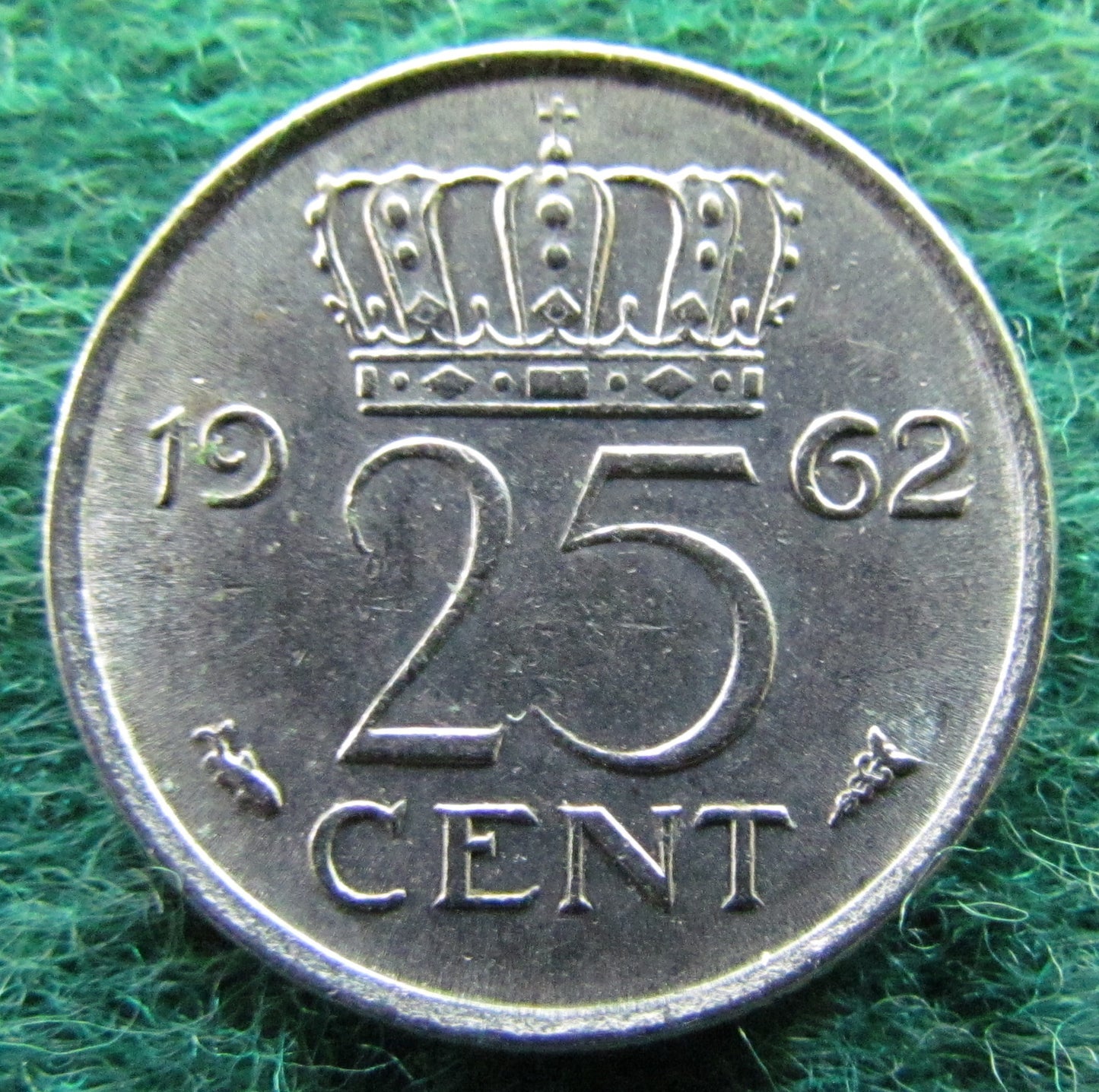 Netherlands 1962 25 Cent Juliana Coin. A good coin showing wear consistent with light to moderate handling in circulation having a sticky surface adhered. Please view images as all images are of the actual item.