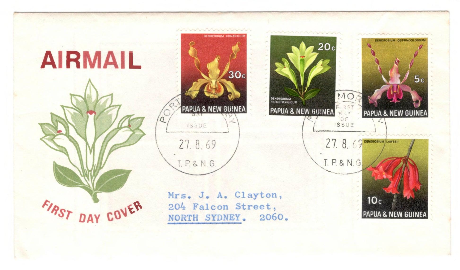 New Guinea PNG 1969 Flora Conservation Orchids First Day Cover FDC. An unsealed airmail addressed FDC with Port Moresby postmark. Please view images as all images are of the actual item.