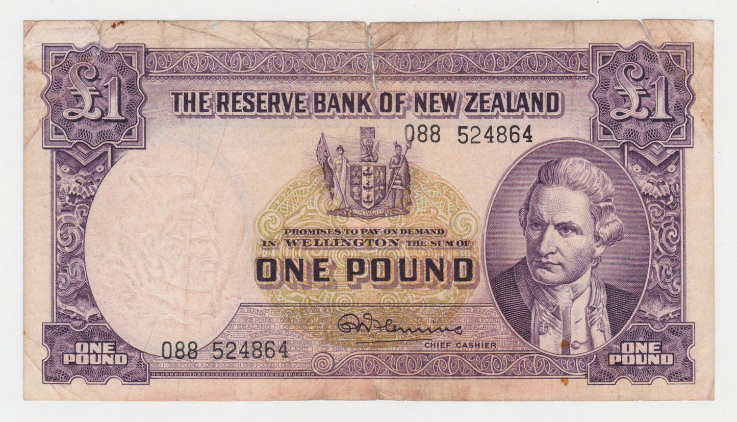 New Zealand 1956 - 1967 1 Pound Note (No Thread) s/n 088 524864