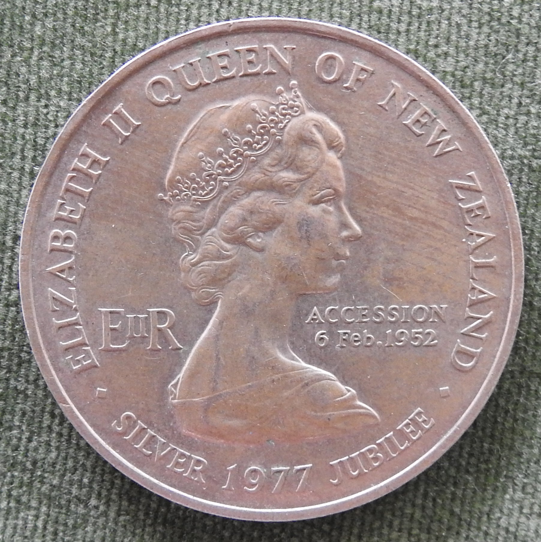 New Zealand 1977 1 Dollar Silver Jubilee Queen Elizabeth II Coin. An uncirculated coin removed from its jewel case and poorly stored. Please view images as all images are of the actual item.