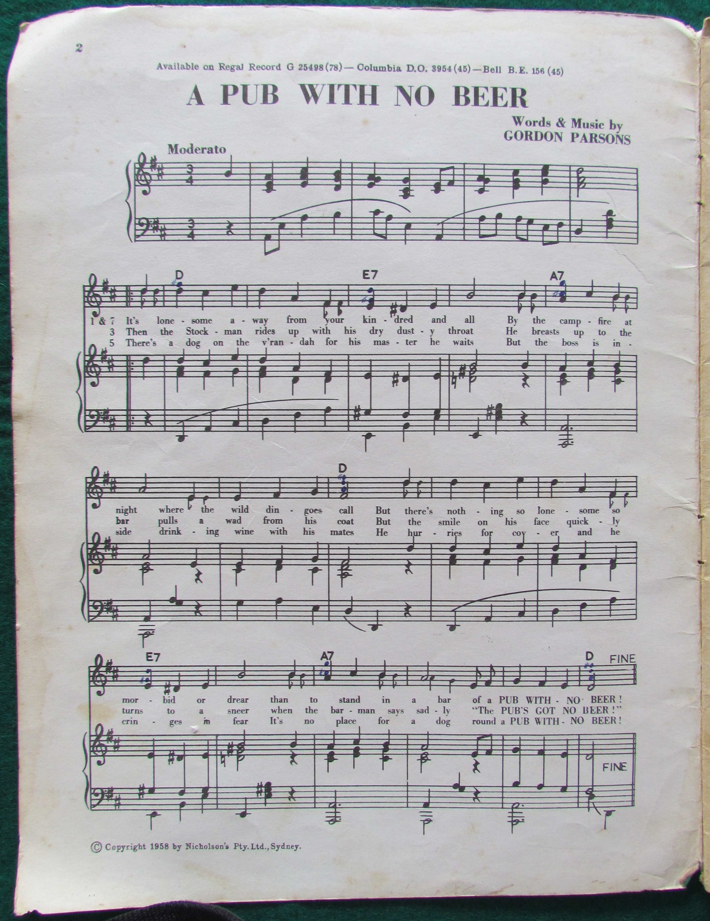 Nicholson's 20th Bushland Song Album Featuring Slim Dusty 1958. A well used copy in fair to good condition with a worn front cover having creases and minor tears. The rear cover has a few rub marks. Internally fair to good with staining from water spillage, toned with bumped corners & edges and some small edge folds. All images are of the actual item.