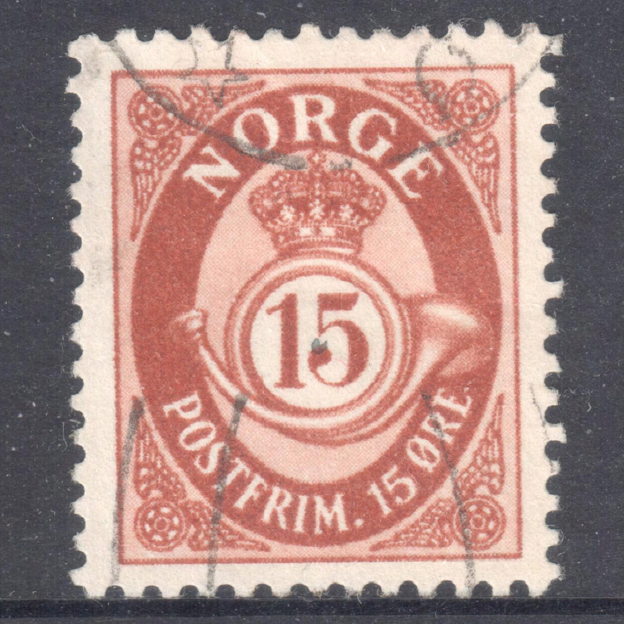 Norway 1951 - 1952 15 Ore Brown Posthorn Stamp - Perf:13. A used & postmarked stamp. The paper is very thin top L/H corner. Please view images as all images are of the actual item.