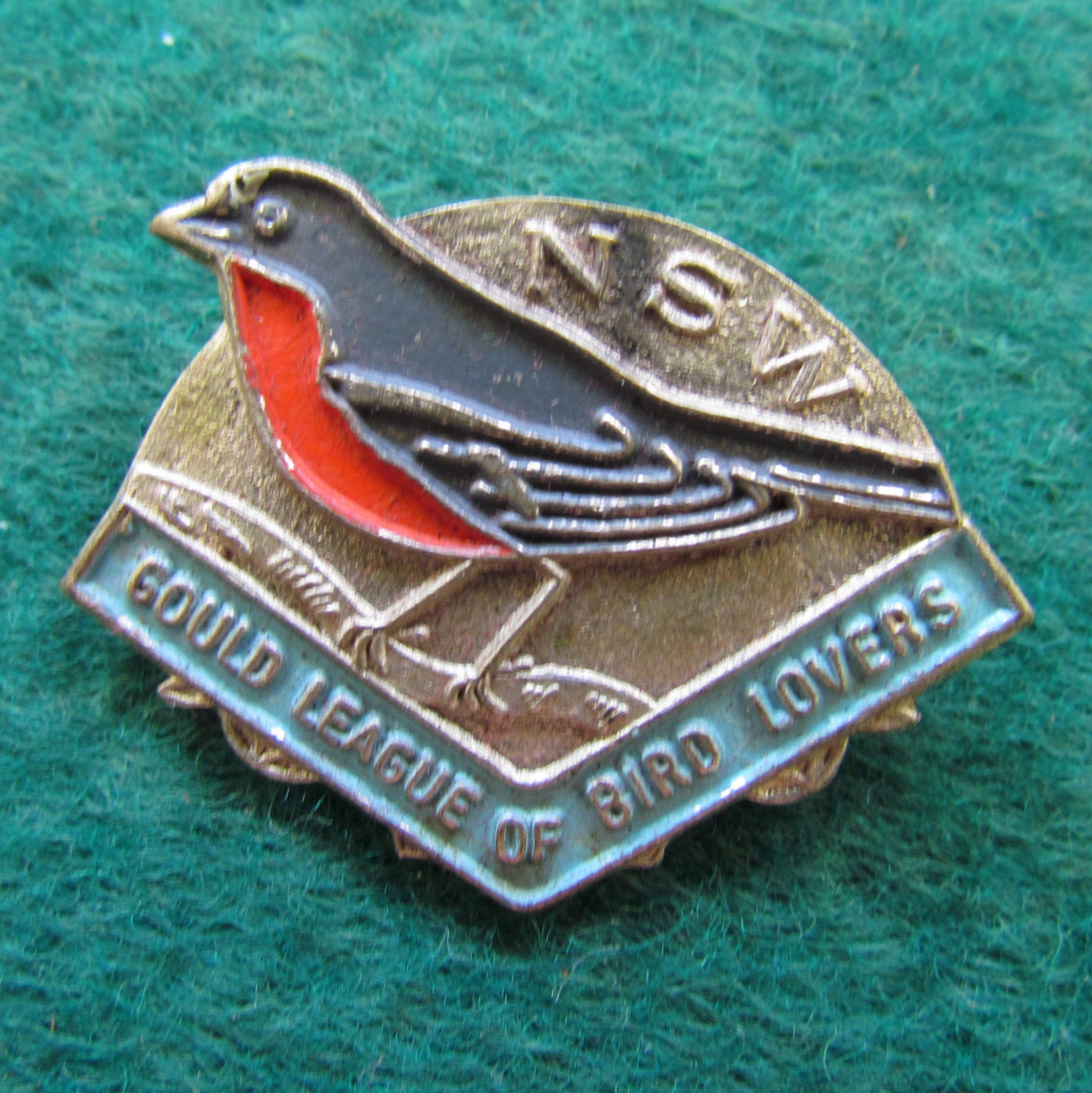 NSW Goulds League OF Bird Lovers 1954 Flame Breasted Robin Badge. A good example of an increasingly harder to find badge showing some wear and tear with a few chips, scratches and minor natural oxidisation, please view images. All images shown are actual item.