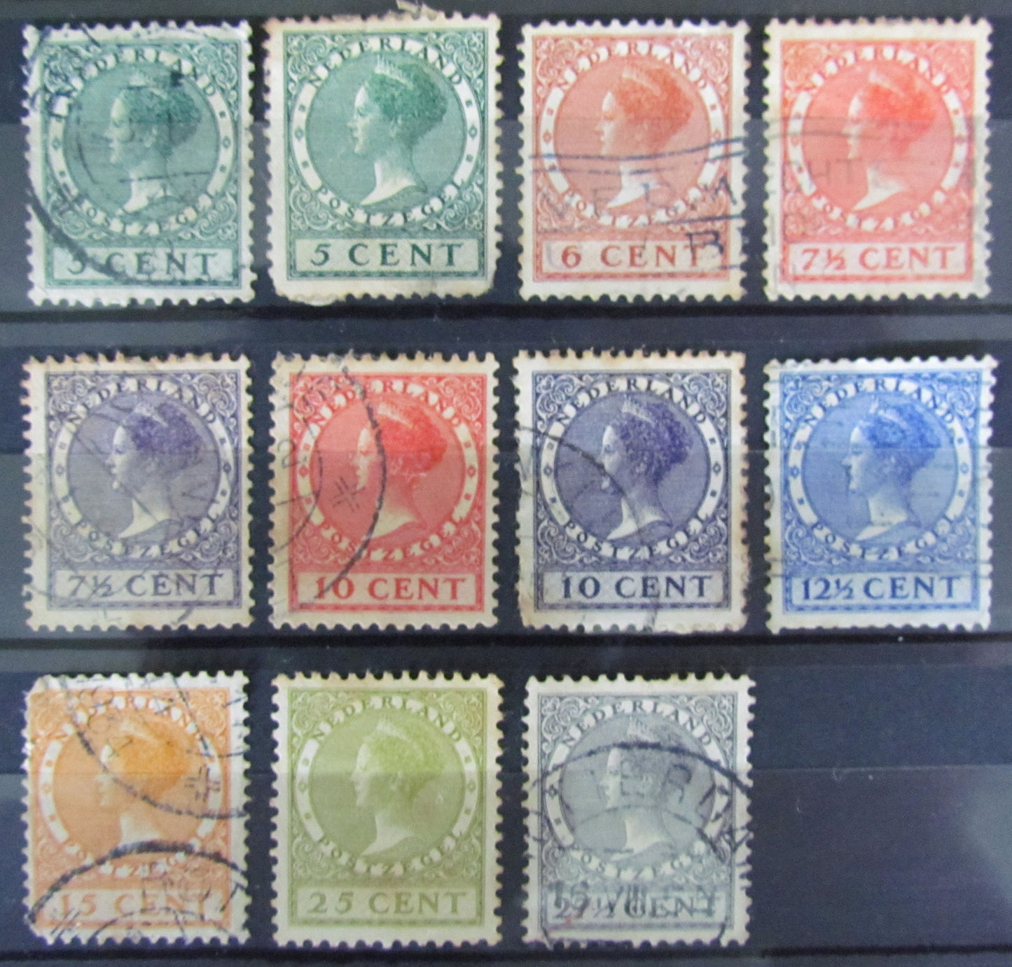 Dutch Netherlands 1924 Queen Wilhelmina Group Of Stamps (11) Cancelled. Includes 5, 5, 6, 7 1/2, 7 1/2, 10, 10, 12 1/2, 15, 25 & 27 1/2 cent issues. Please view images as all images are of the actual item.