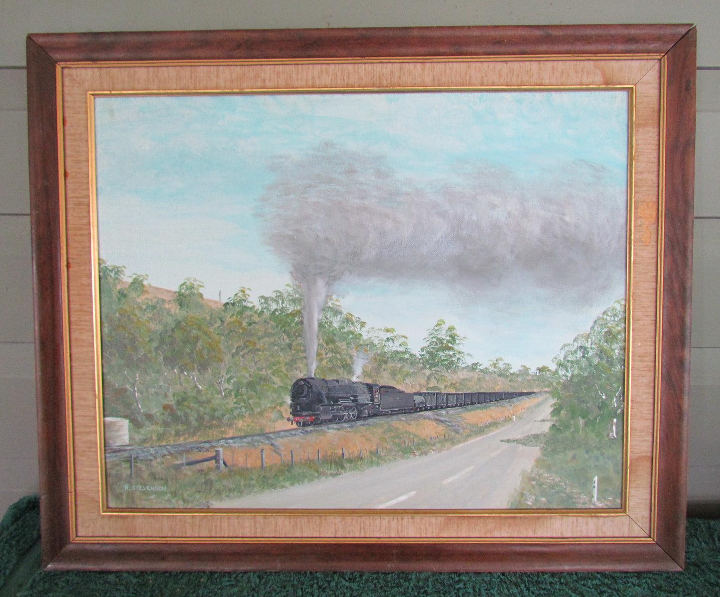 R Stevenson South African Artist Oil On Board Of A Coal Train In The Veld. Signed Lower Left. Frame needs attention. Please view images as all images are of the actual item.